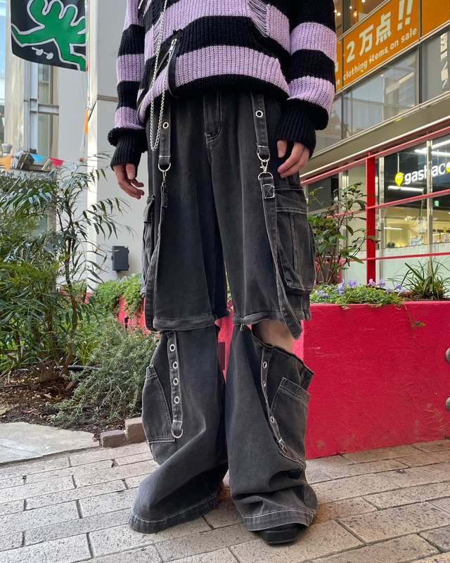 男女兼用item 【サイズ】メンズ約S・Mサイズ S (約)ウェスト68cm 総丈104cm 股下74cm M (約)ウェスト72cm 総丈106cm 股下76cm 【カラー】ウォッシュ メンズモデル*156cm(Sサイズ着用) 《商品説明》 左右ハーネス付き、カーゴのルーズシルエットパンツ。カラーはウォッシュ加工を施したブラック系。ひざから下は取り外し可能で、ハーフパンツとしても着用できる2way仕様。また、裾のサイドジップは開け閉めすることでシルエットに変化を持たせてくれます。 【ご購入の前に】 ・商品写真はできる限り実物の色に近づけるようにしていますがお使いのモニター設定や撮影時の照明等により実際の商品と色味が異なる場合がございます。 ・色味のイメージ違い、サイズ感違いによる交換返品は問い合わせ頂きましてもご対応は致しません。 ご注文前にカラーイメージ、サイズ感について連絡いただいた場合は要相談でご対応致します。
