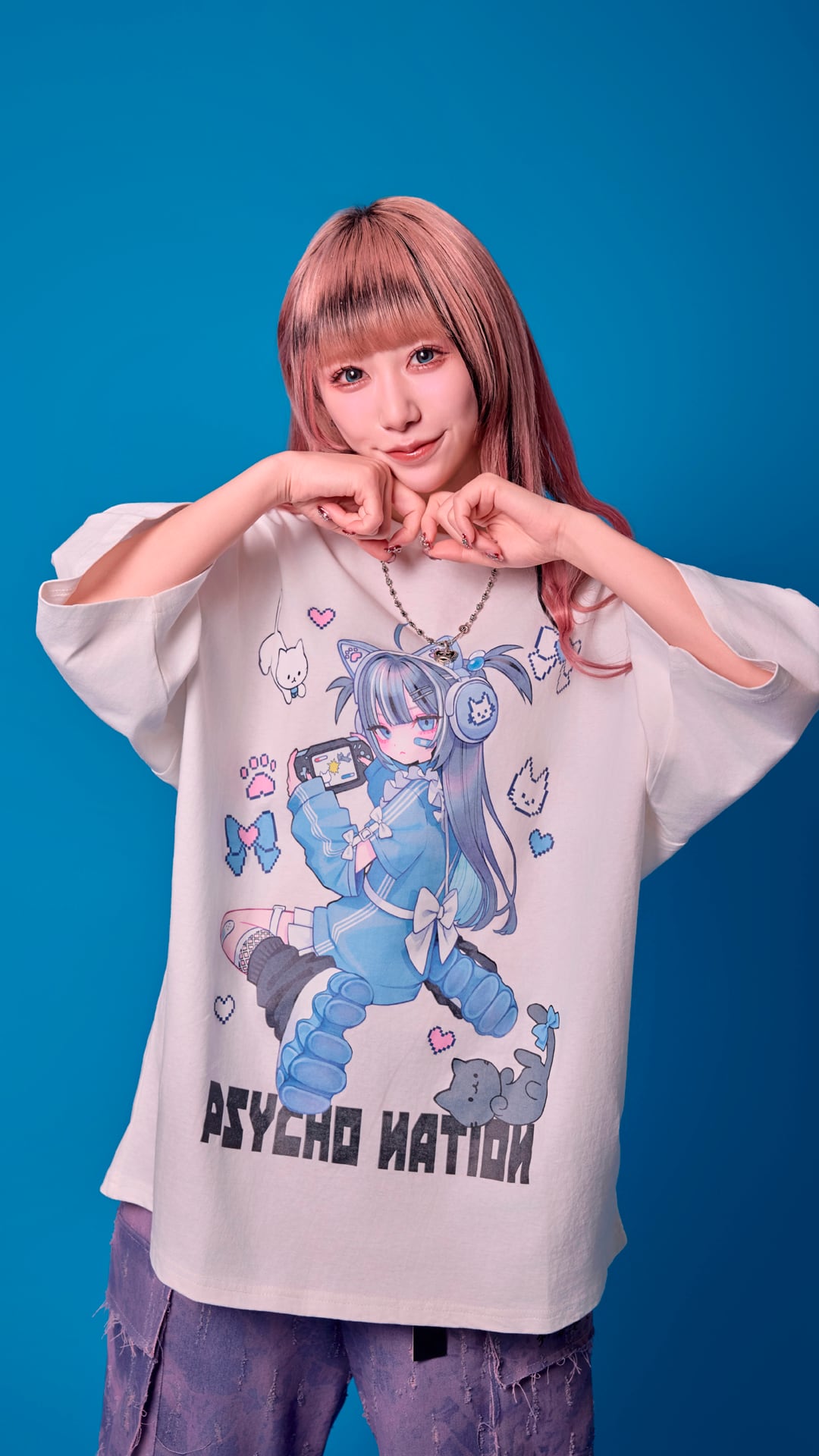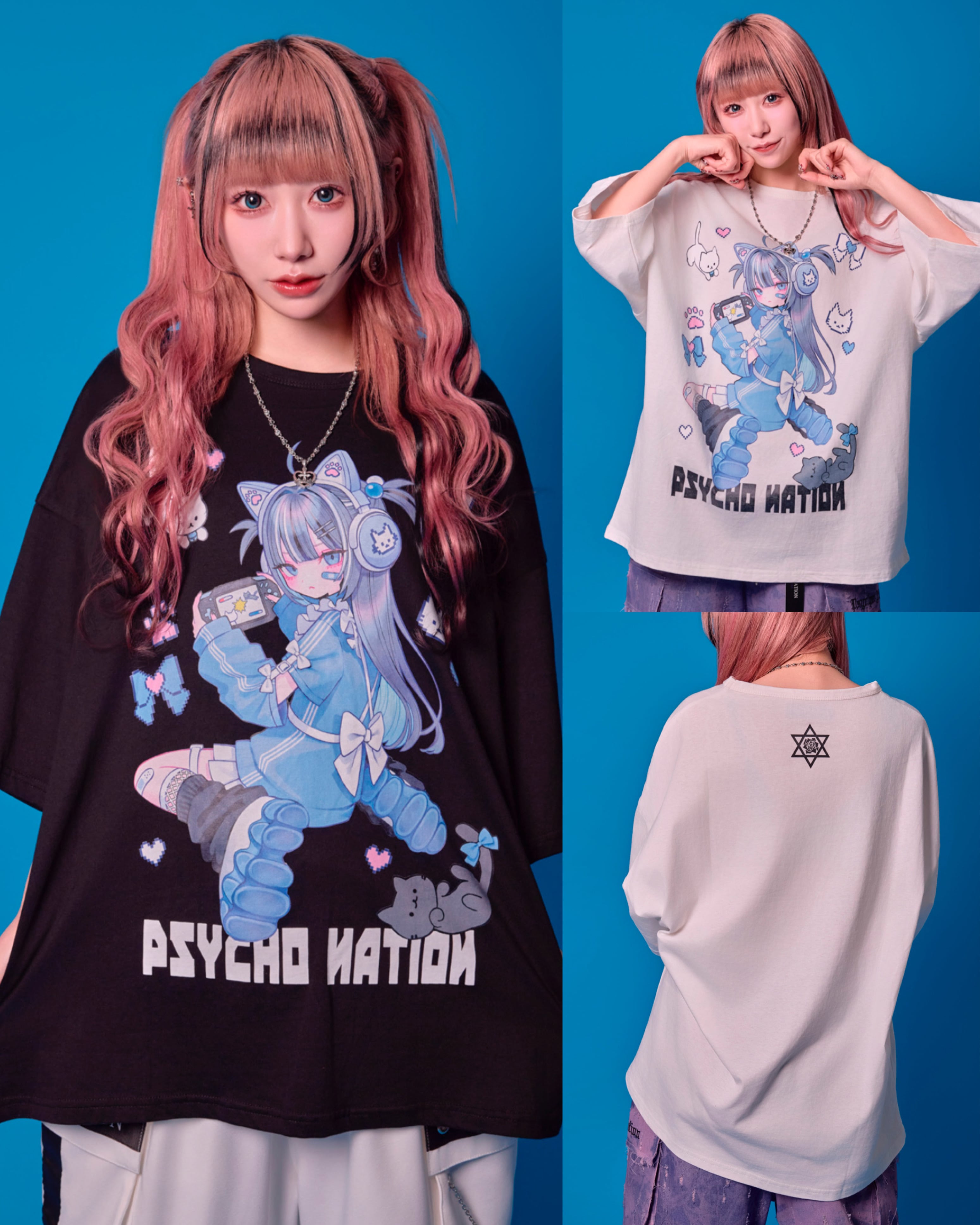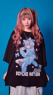 人気イラストレーター寝田ルネとのコラボレーション・アイテム!オーバーサイズTシャツ登場!フロントに寝田ルネ書き下ろしゲーマーチーフのイラスト入り。バックにはPSYCHO NATIONのロゴをデザインしたかっこかわいい、ロックテイスト溢れるデザイン。男女問わず、ジェンダーレスに使えるゆったり大きめのオーバーサイズのサイジングは体型カバーできるので体型に拘わらず着用頂けます。