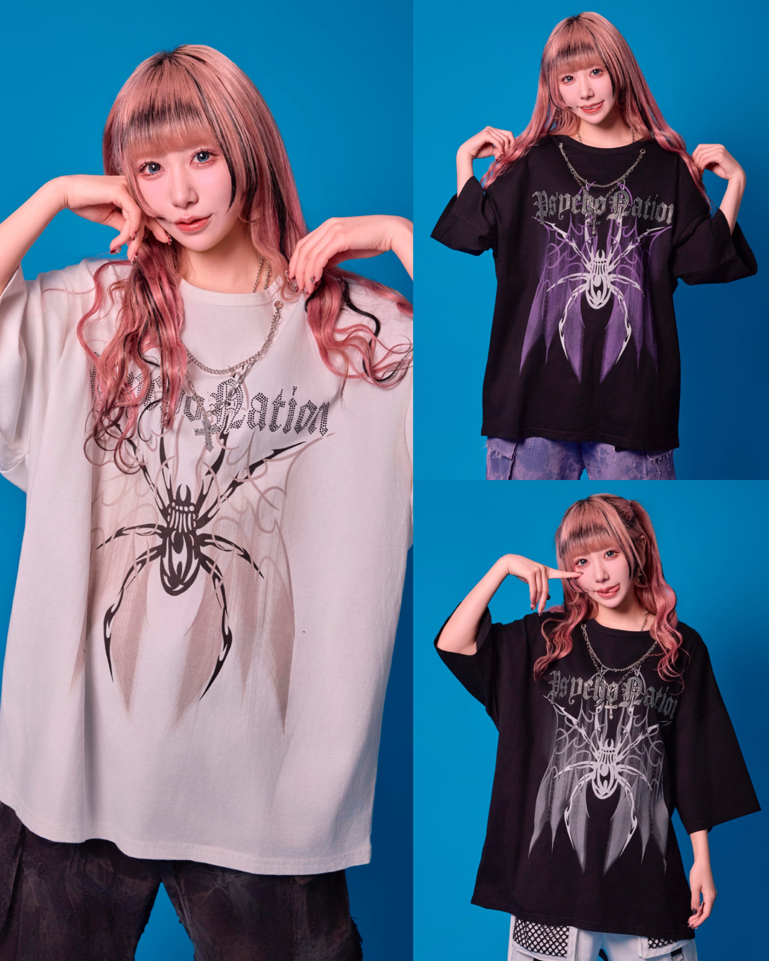 取り外し可能な十字ネックチェーン付きBIG Tシャツ。フロントにはストーン入りのロゴ+大きくプリントされたスパイダー。バックにはワンポイントロゴ。パンクロックなテイストでゆったり着れるオーバーサイズのTシャツは体型カバーと併せてトレンド感をしっかり出しながら抜け感をもって着用できます。