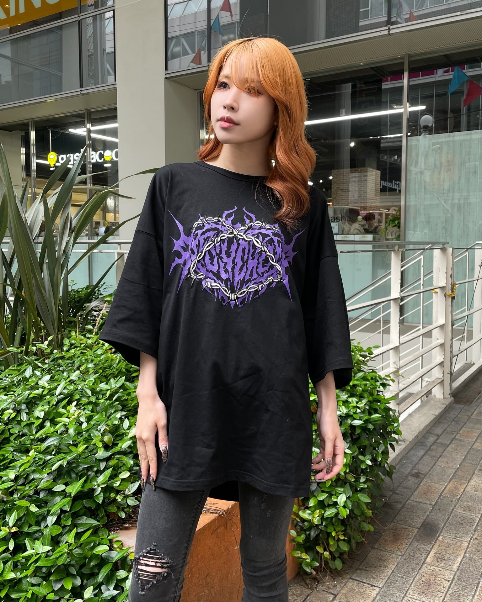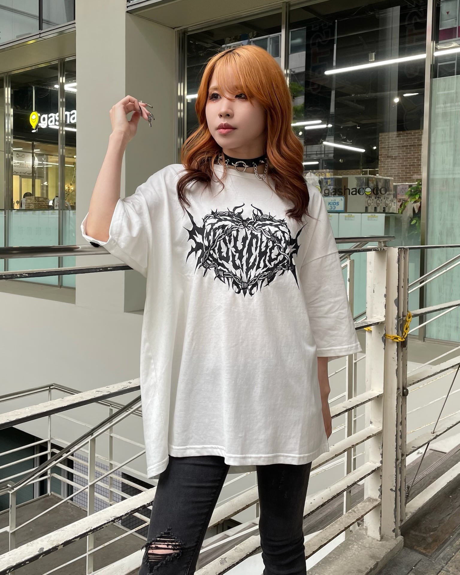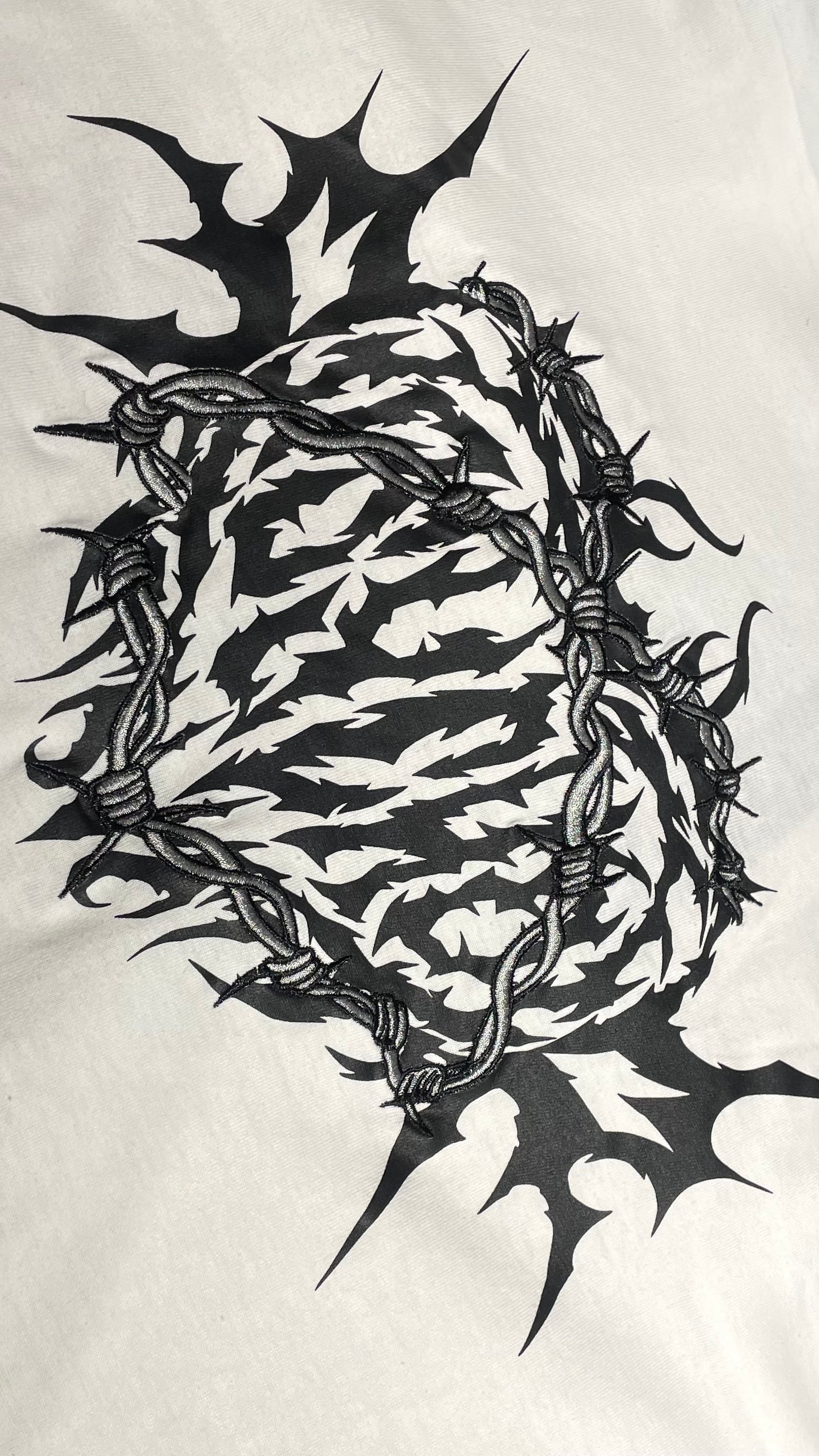 フロントに鎖を纏ったハート、悪魔羽のイラスト刺繍入り。バックにはレースアップでデザインされたお洒落なデザイン。パンクロックなテイストでゆったり着れるオーバーサイズのTシャツは体型カバーと併せてトレンド感をしっかり出しながら抜け感をもって着用頂けます。