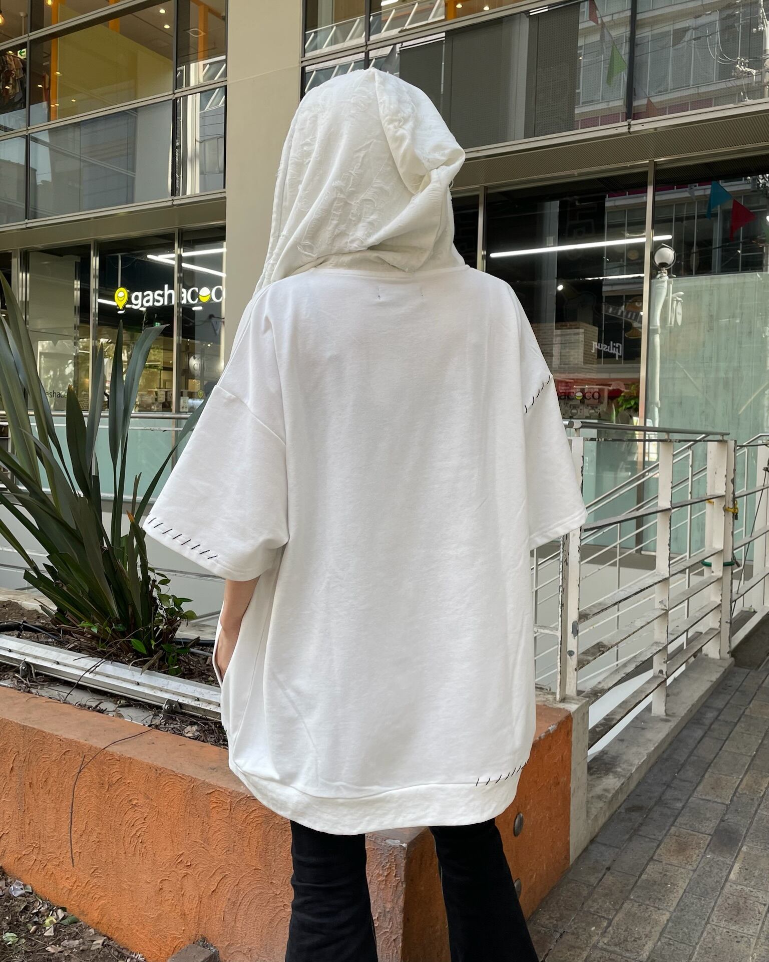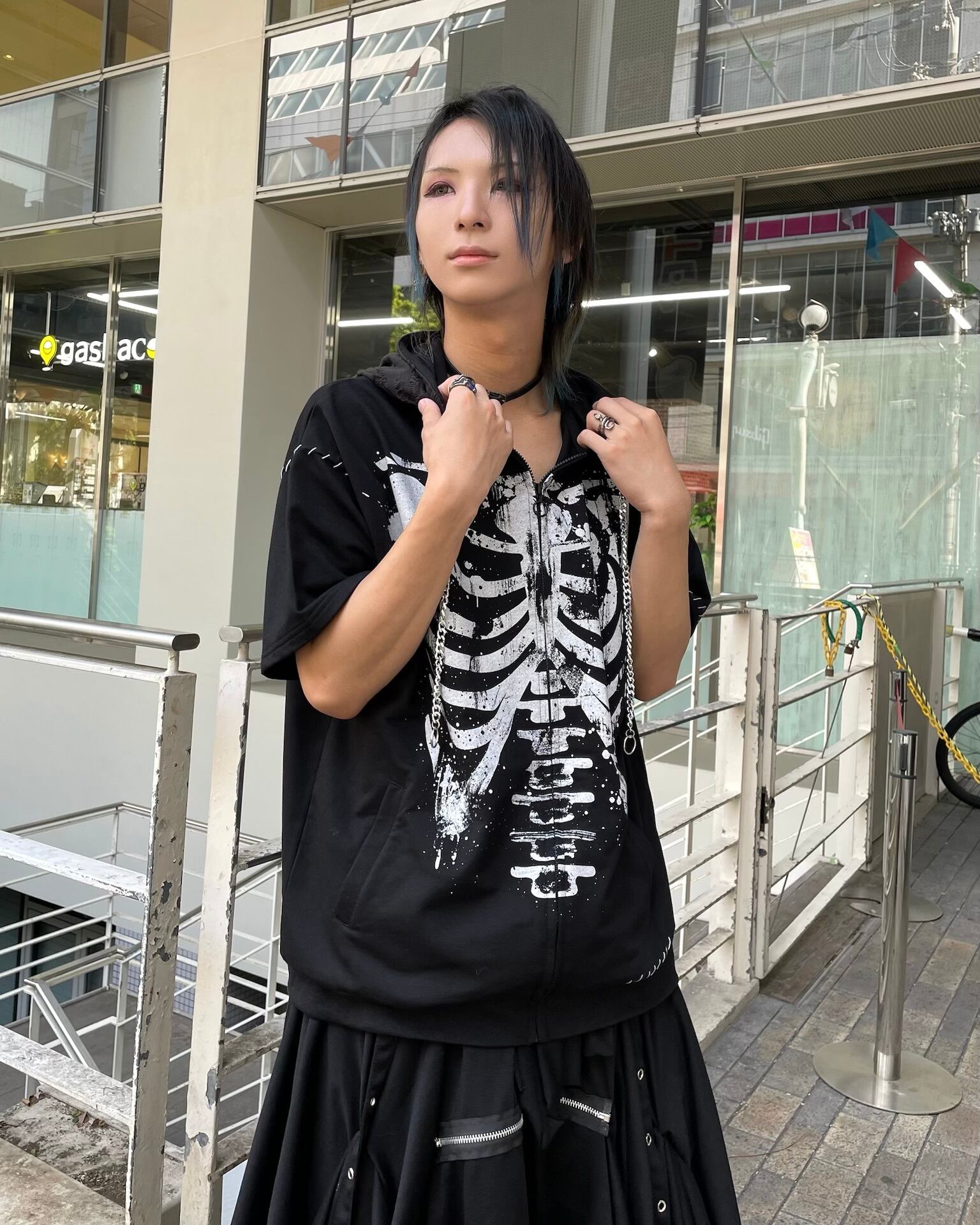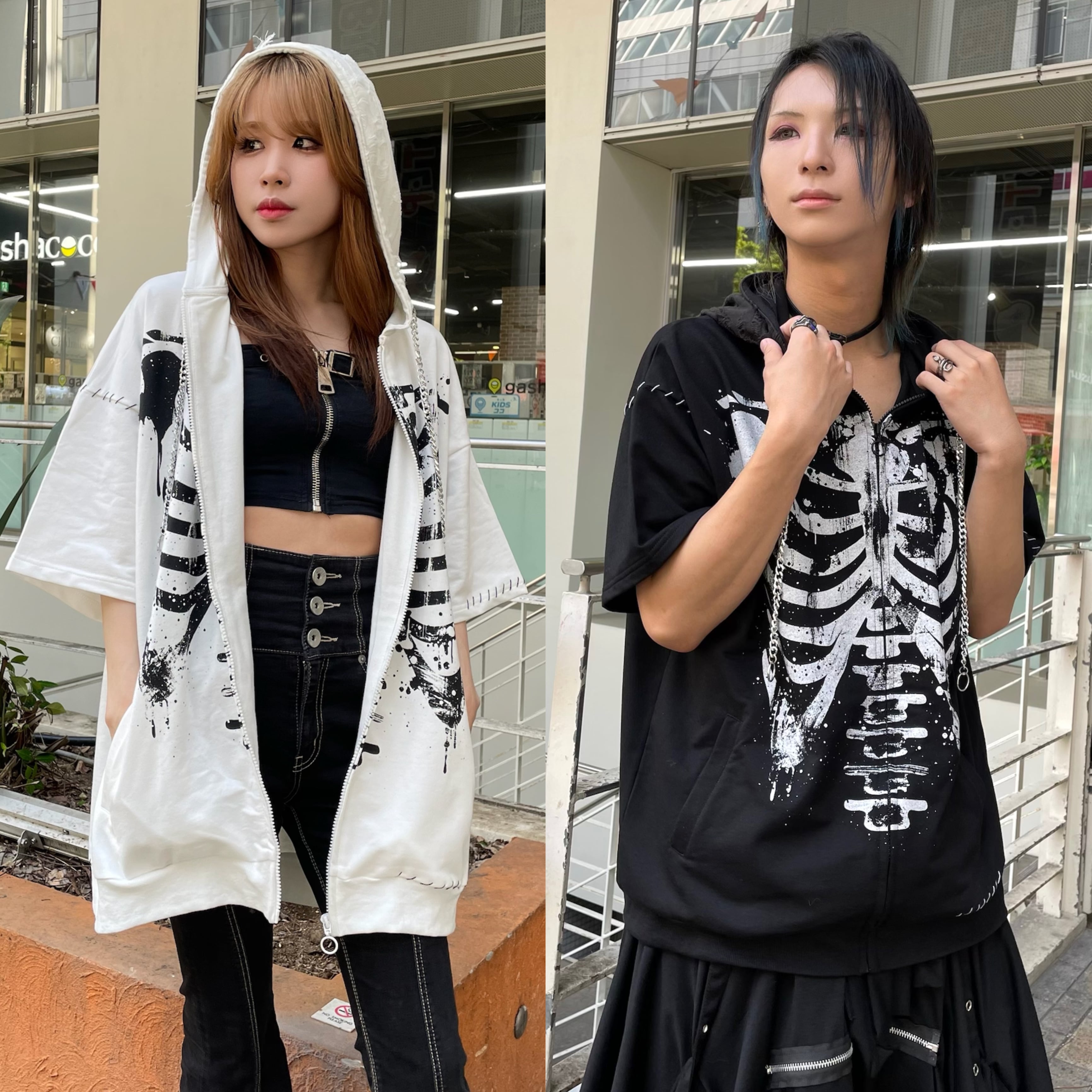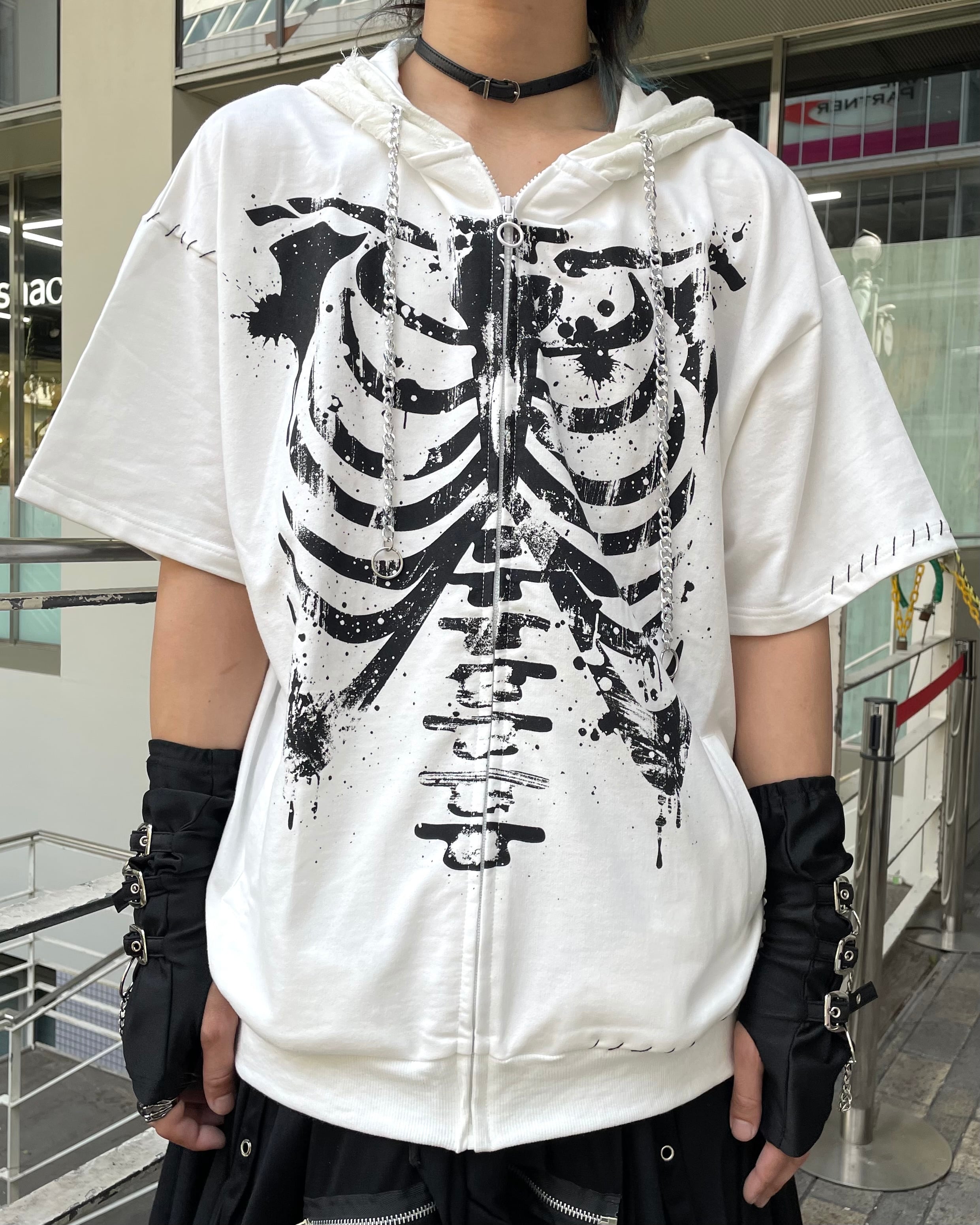 フロントにスケルトンプリント入りのZIP半袖パーカー!フードに鎖チェーン。所々にステッチ入り!体型カバーと併せてトレンド感をしっかり出しながら抜け感をもって着用頂けます。この夏ゆったりラフに羽織れるロックなアイテム!