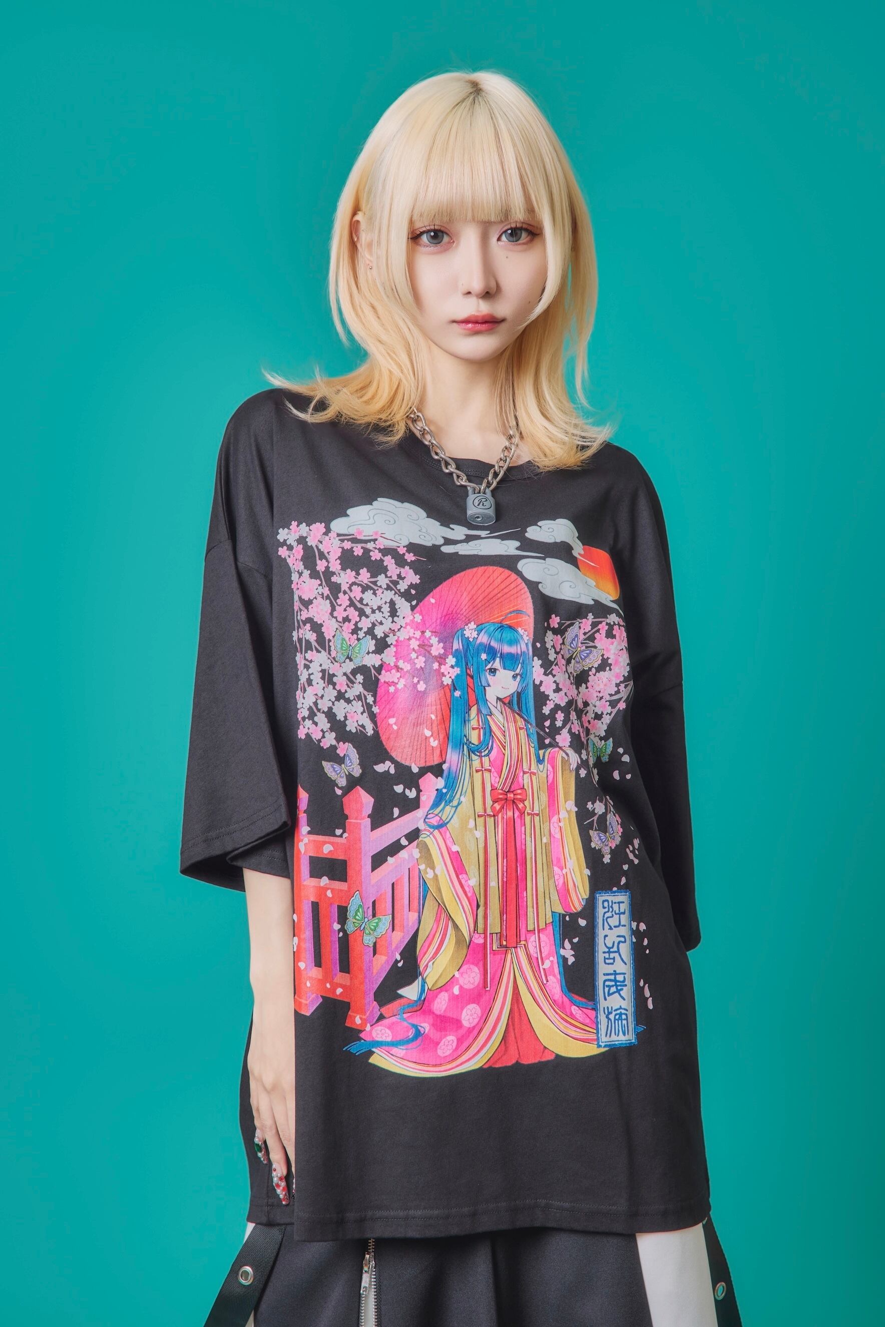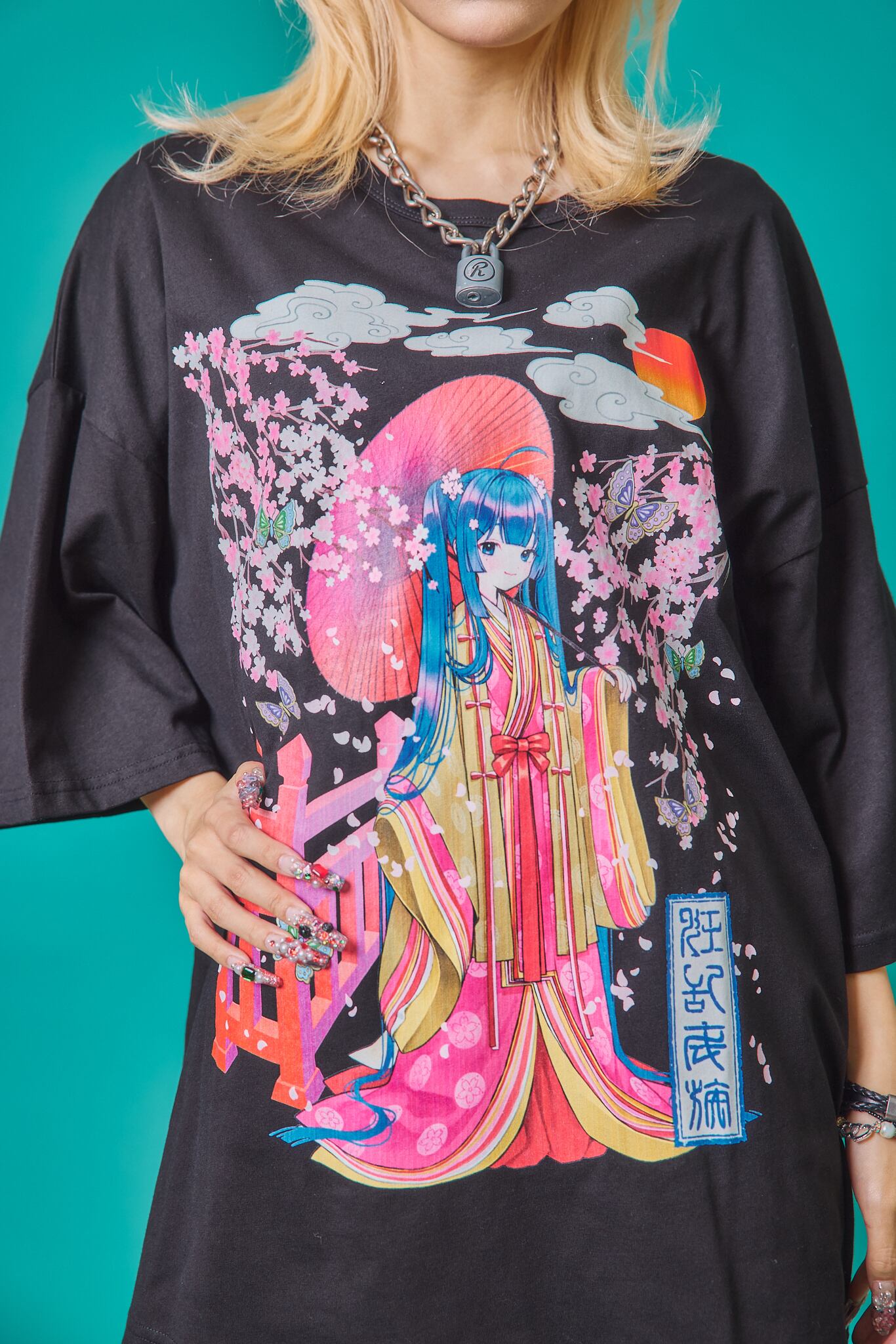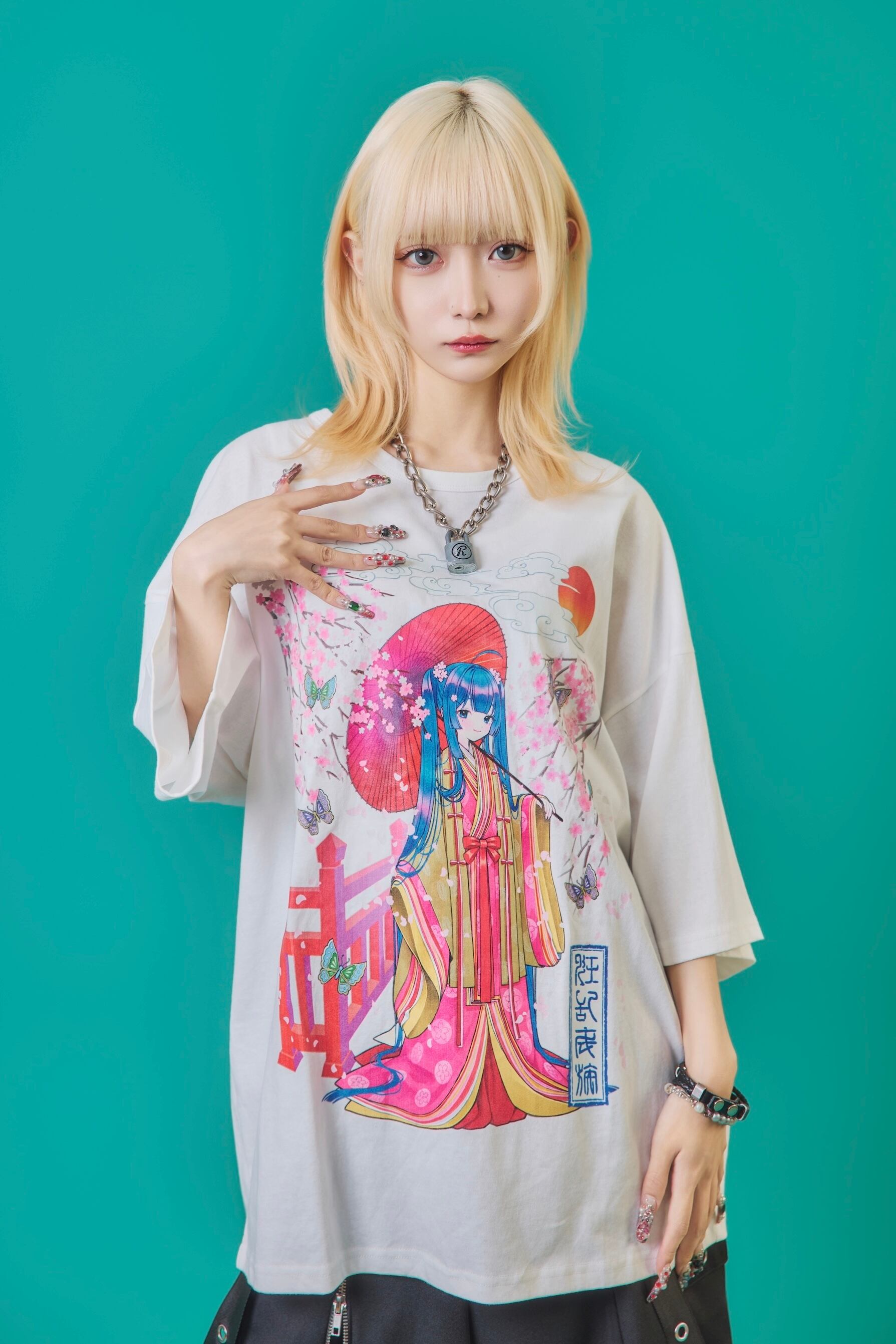 フロントに寝田ルネ書き下ろしの桜着物イラスト、バックにはワンポイントロゴ入り。和風テイストでゆったり着れるオーバーサイズのTシャツは体型カバーと併せてトレンド感をしっかり出しながら抜け感をもって着用頂けます。