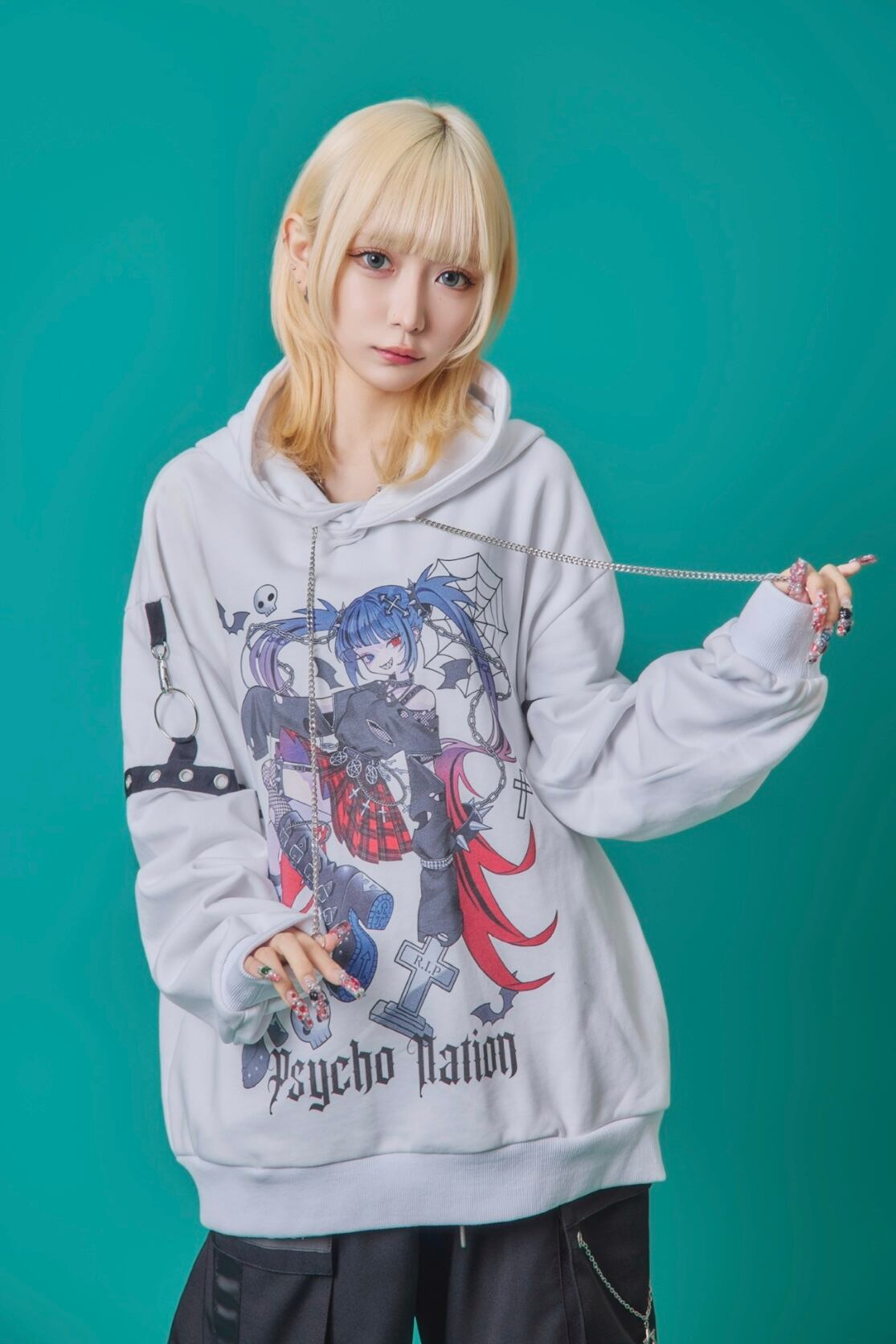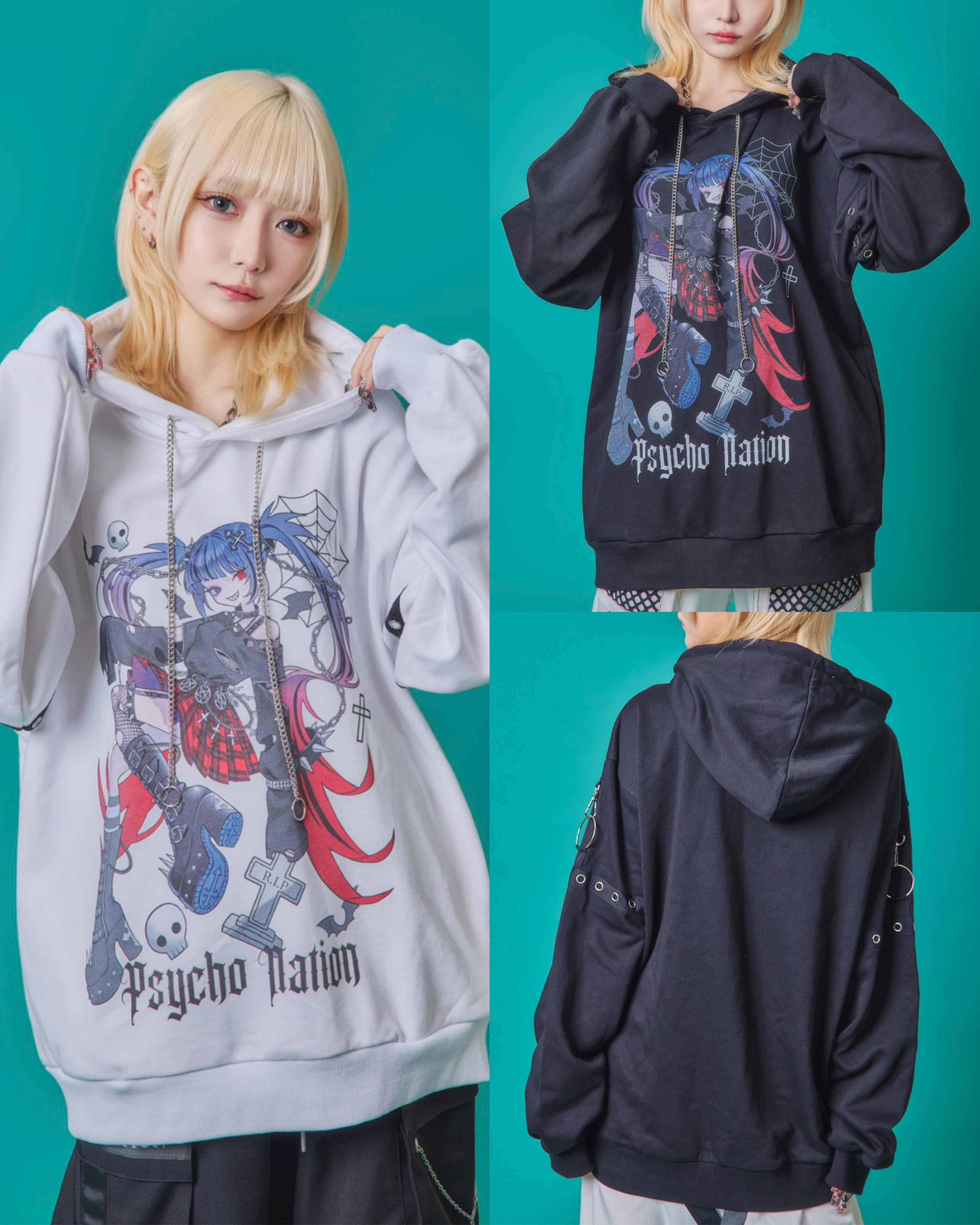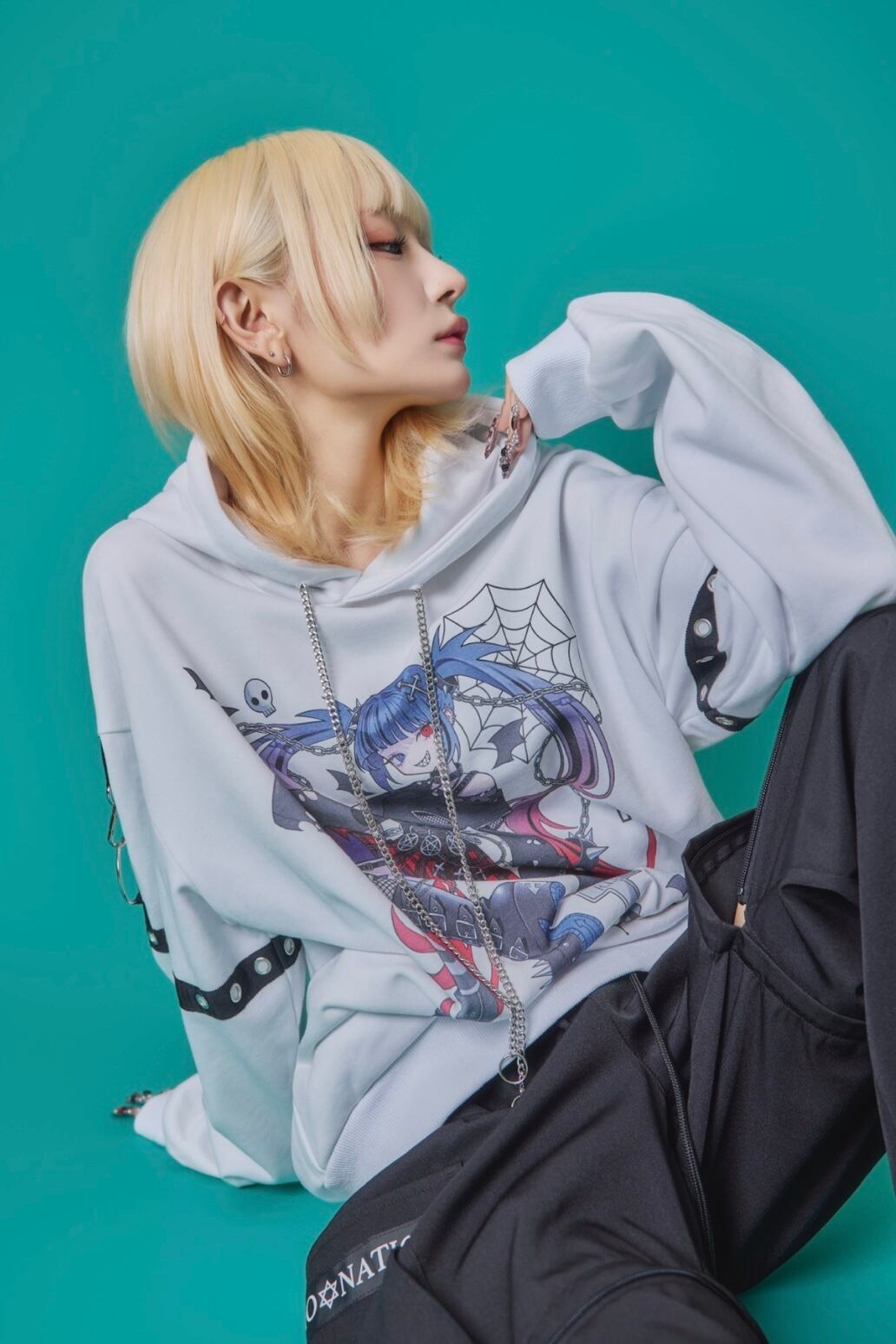 寝田ルネコラボ。鎖チェーン+両袖のリングパーツがパワーアクセント!フロントにはパンクなイラスト。オーバーサイズ、体型カバーと併せてトレンド感をしっかり出しながら抜け感をもって着用頂けます。
