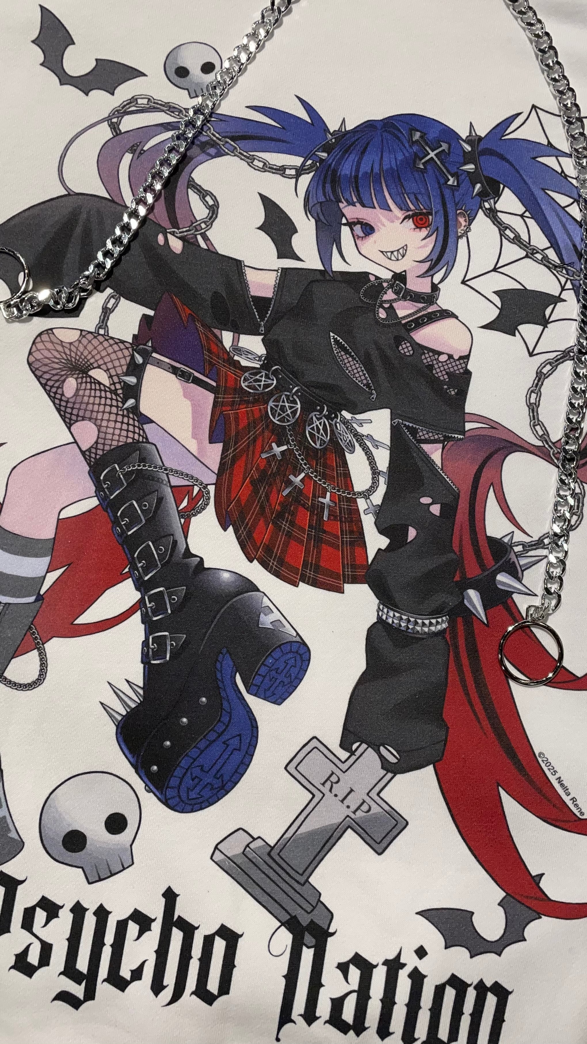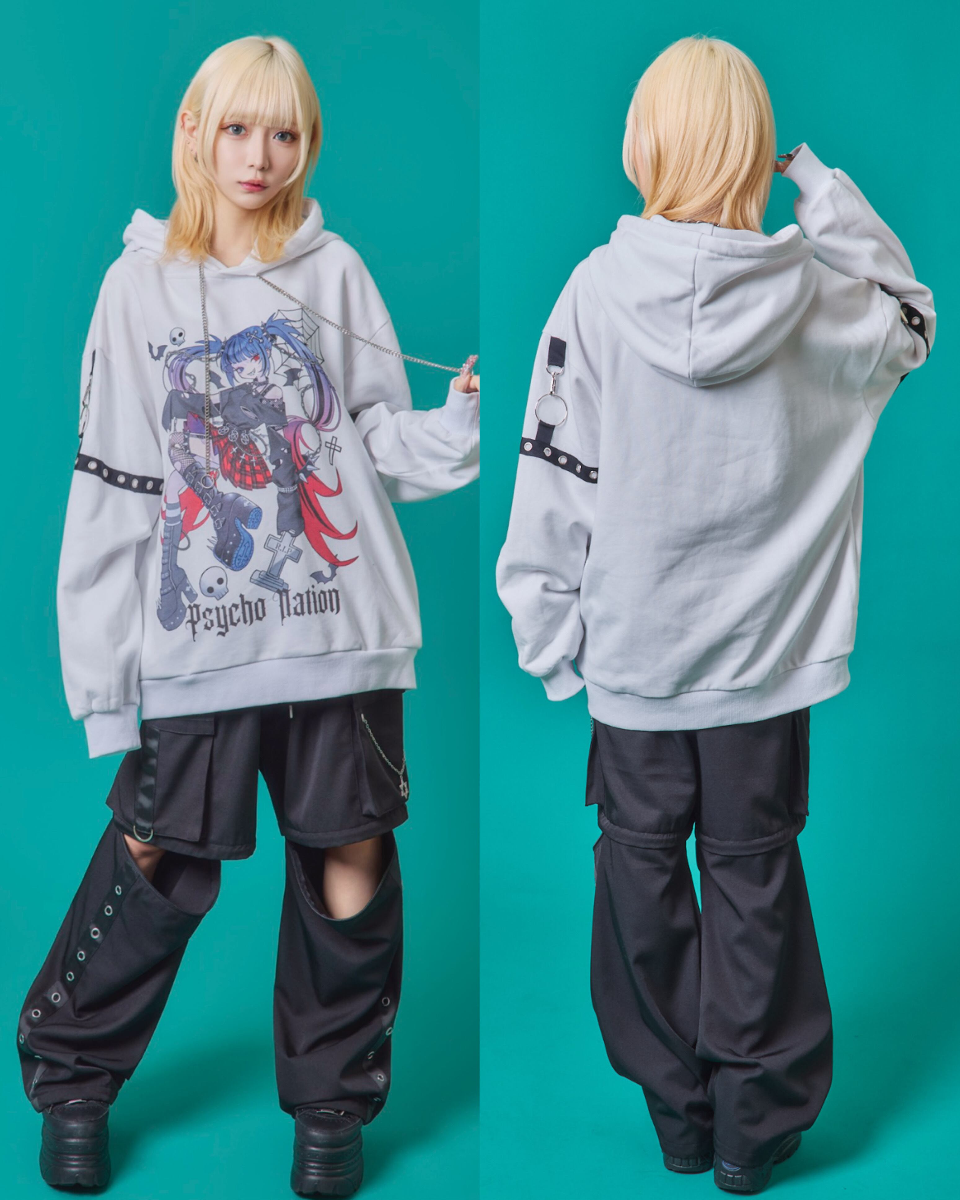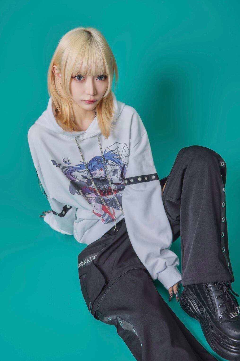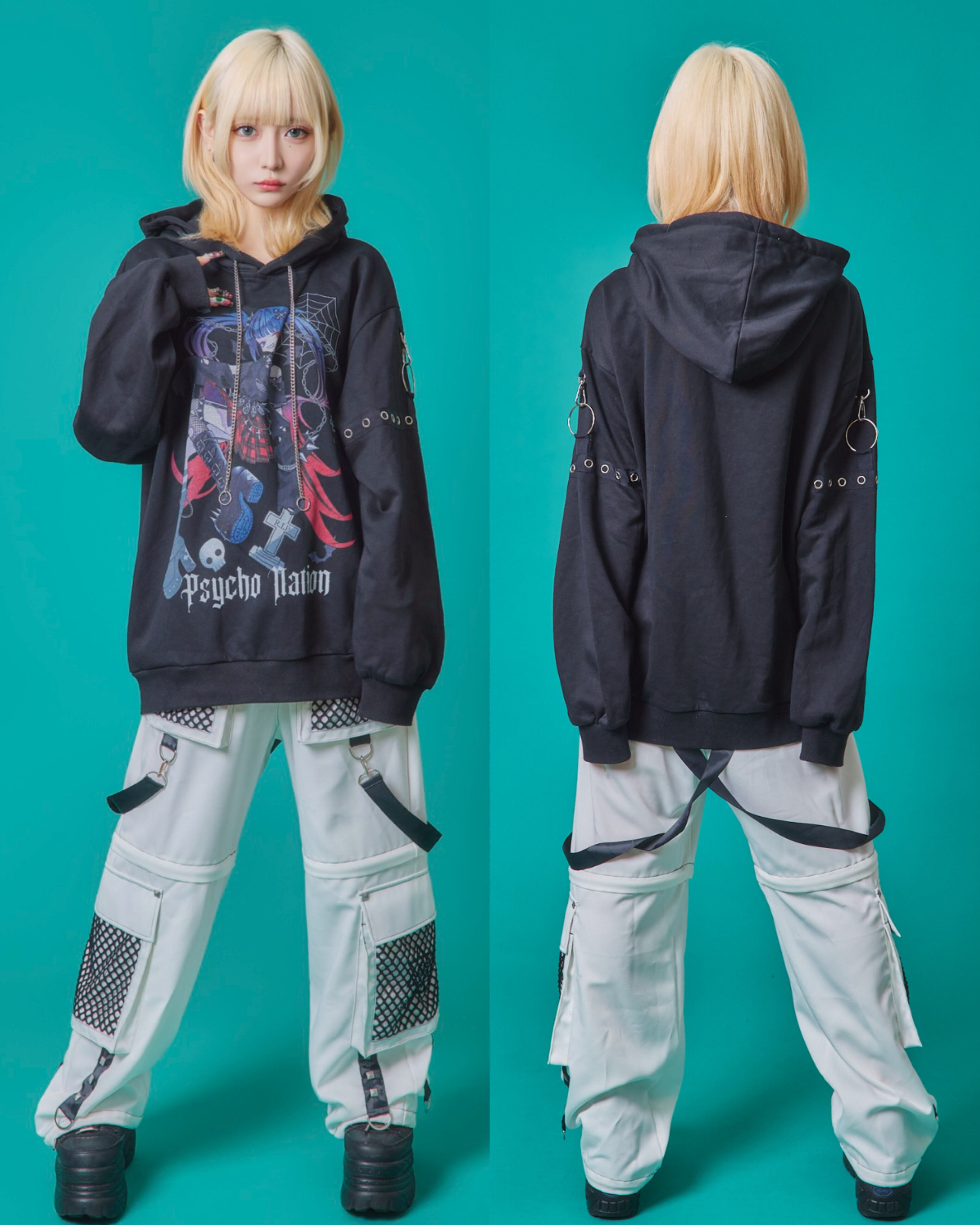 寝田ルネコラボ。鎖チェーン+両袖のリングパーツがパワーアクセント!フロントにはパンクなイラスト。オーバーサイズ、体型カバーと併せてトレンド感をしっかり出しながら抜け感をもって着用頂けます。