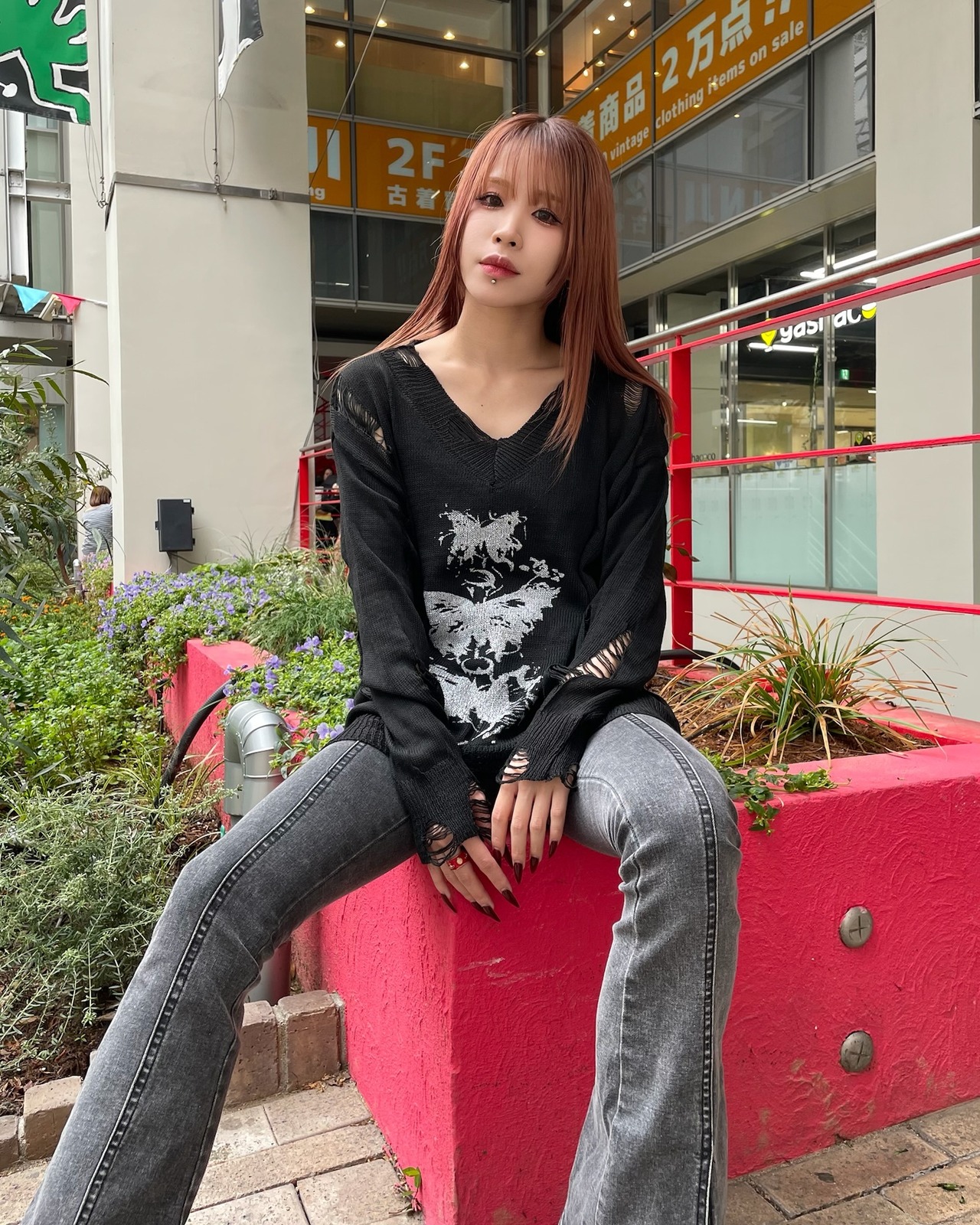 随所に施したダメージ加工がインパクト大!月と蝶をモチーフにしたプリント入り。薄手の生地感となります。y2k、サブカルにも着用頂ける一枚。