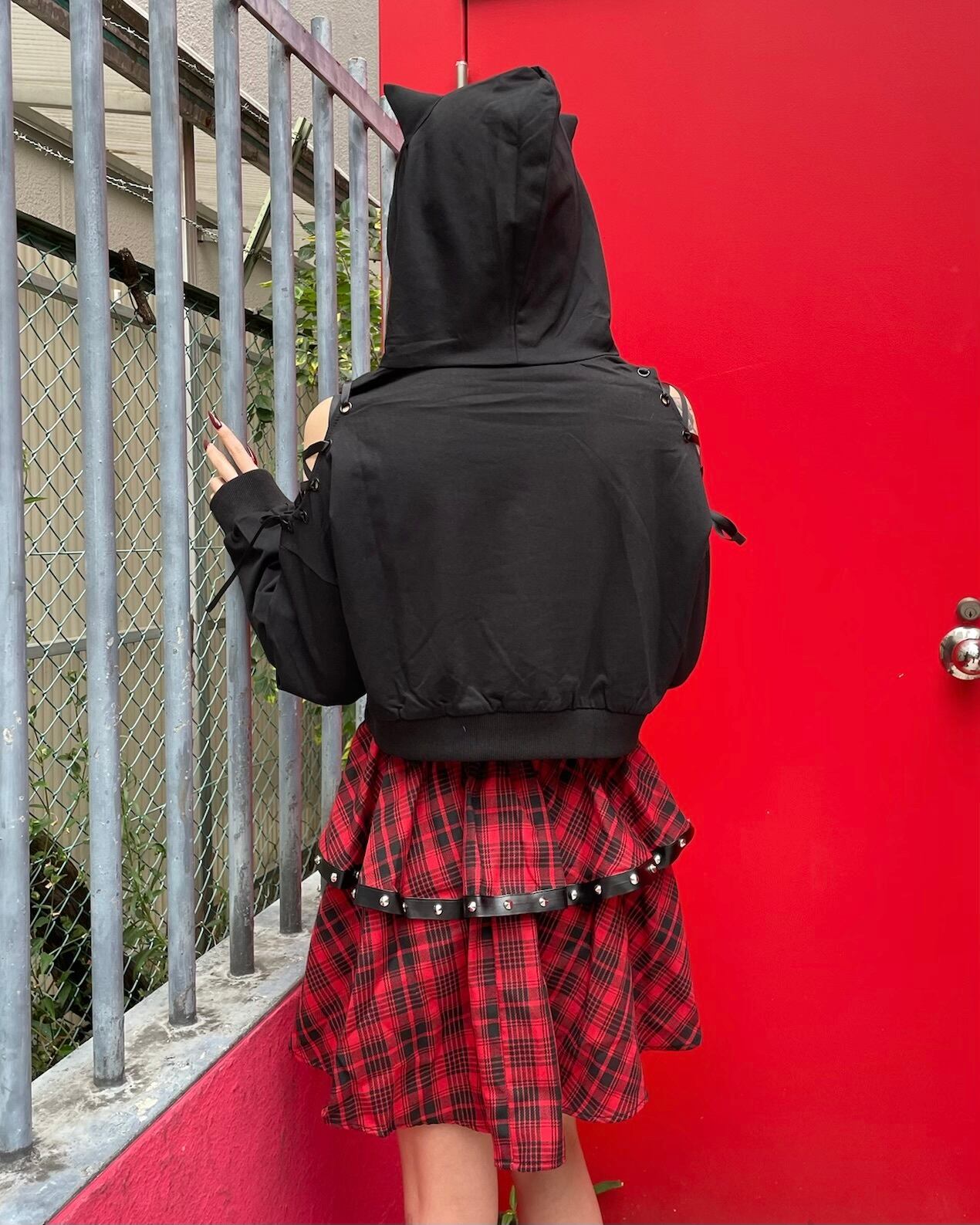 猫耳フードとレースアップのデザインが特徴的なクロップパーカー!トレンド感漂うシルエットに闇カワデザインを落とし込んだ一着。サラッと着るだけで他には無いキュートなスタイリングを演出してくれます。