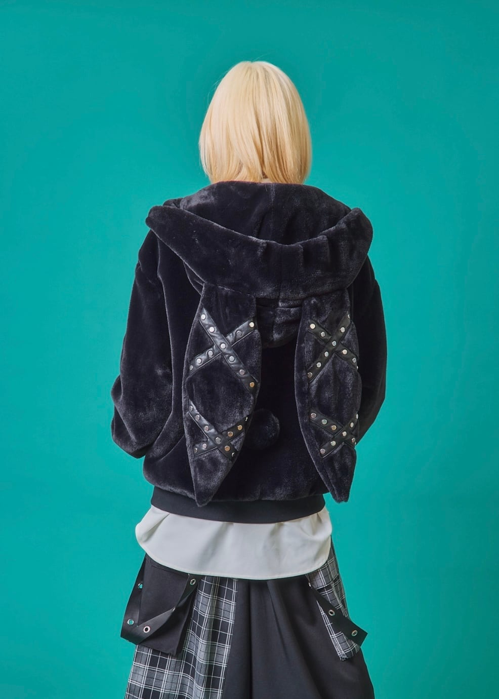 可愛い+punkなデザインを加えたうさ耳とシャープなイメージのチェーンが融合し、個性的で病みカワなアウター。暖かみがあり柔らかくふんわりしたファー素材は肌さわりが良く着心地抜群!