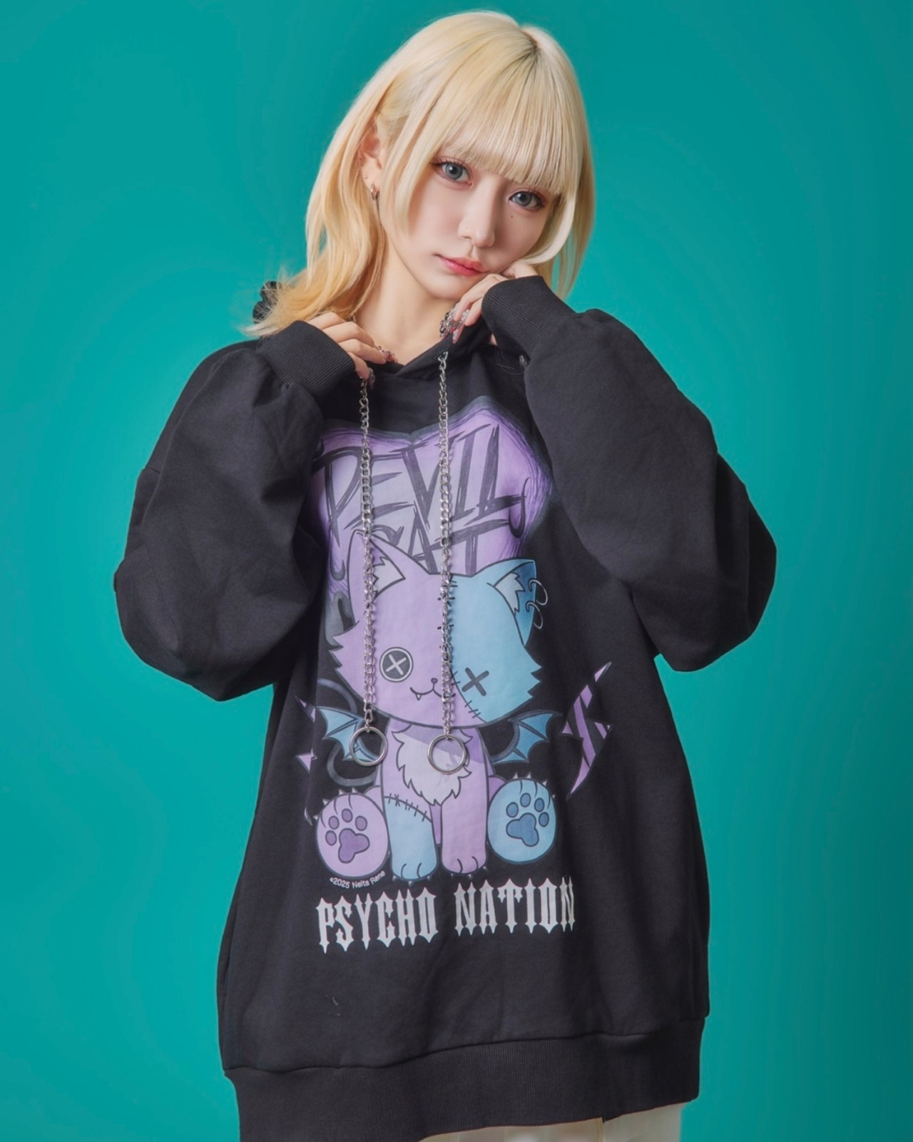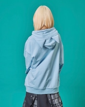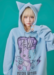 寝田ルネコラボ。猫耳フード付き!猫デビルイラスト。オーバーサイズで体型カバーと併せてトレンド感をしっかり出しながら抜け感をもって着用頂けます。