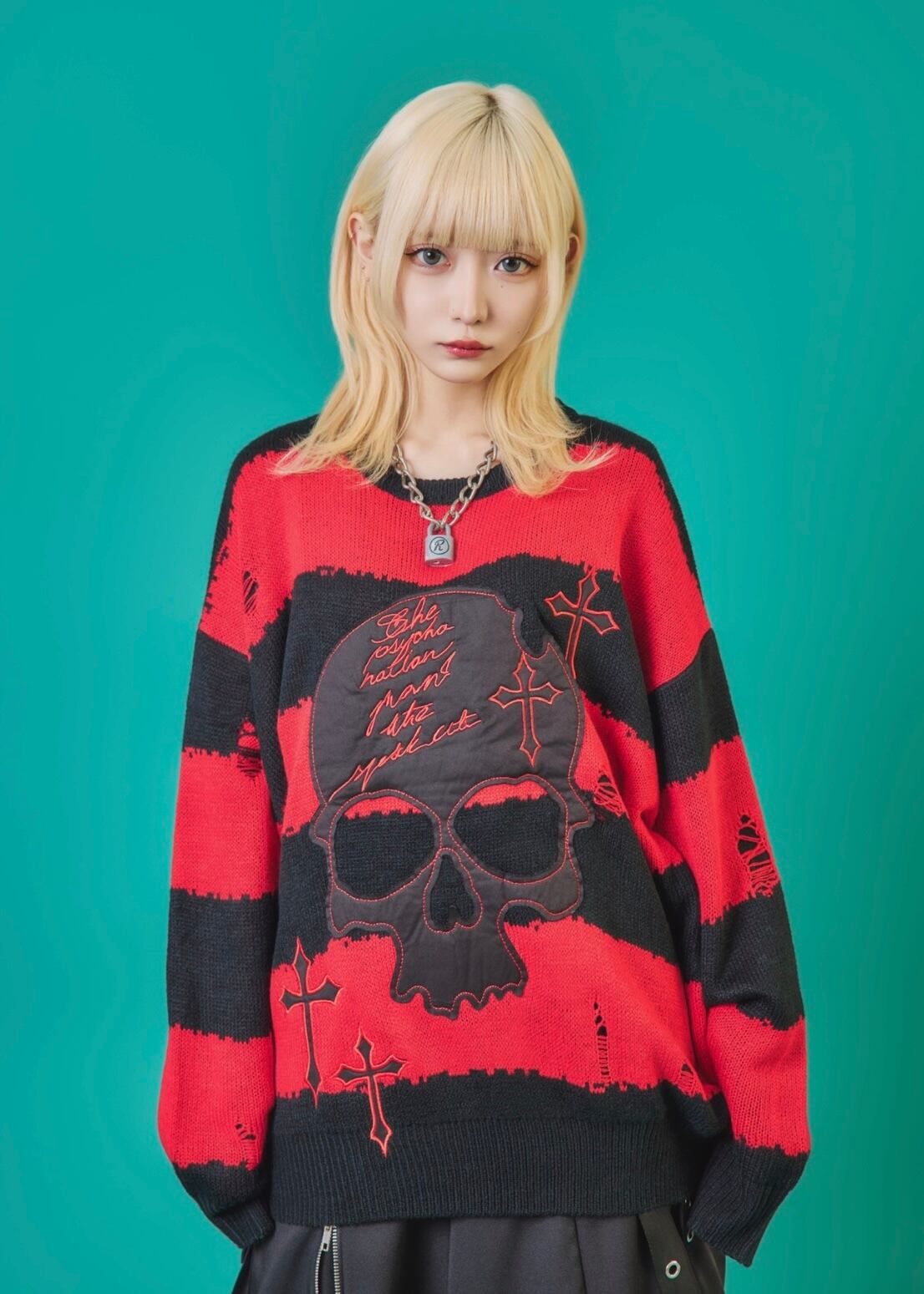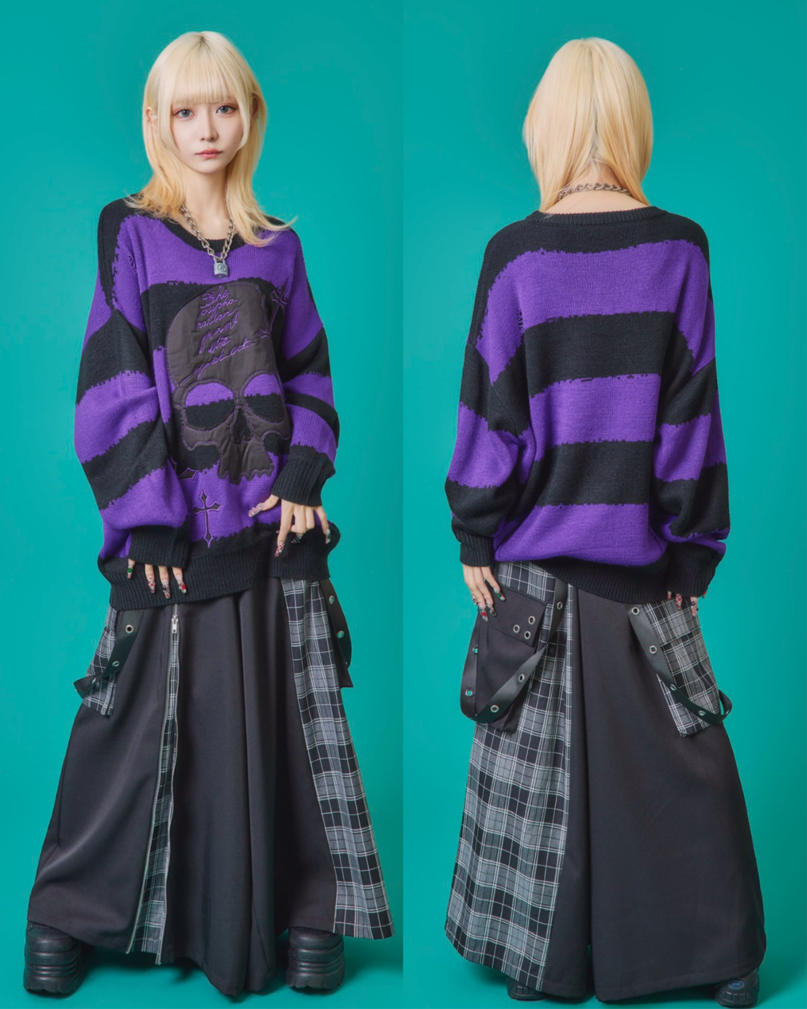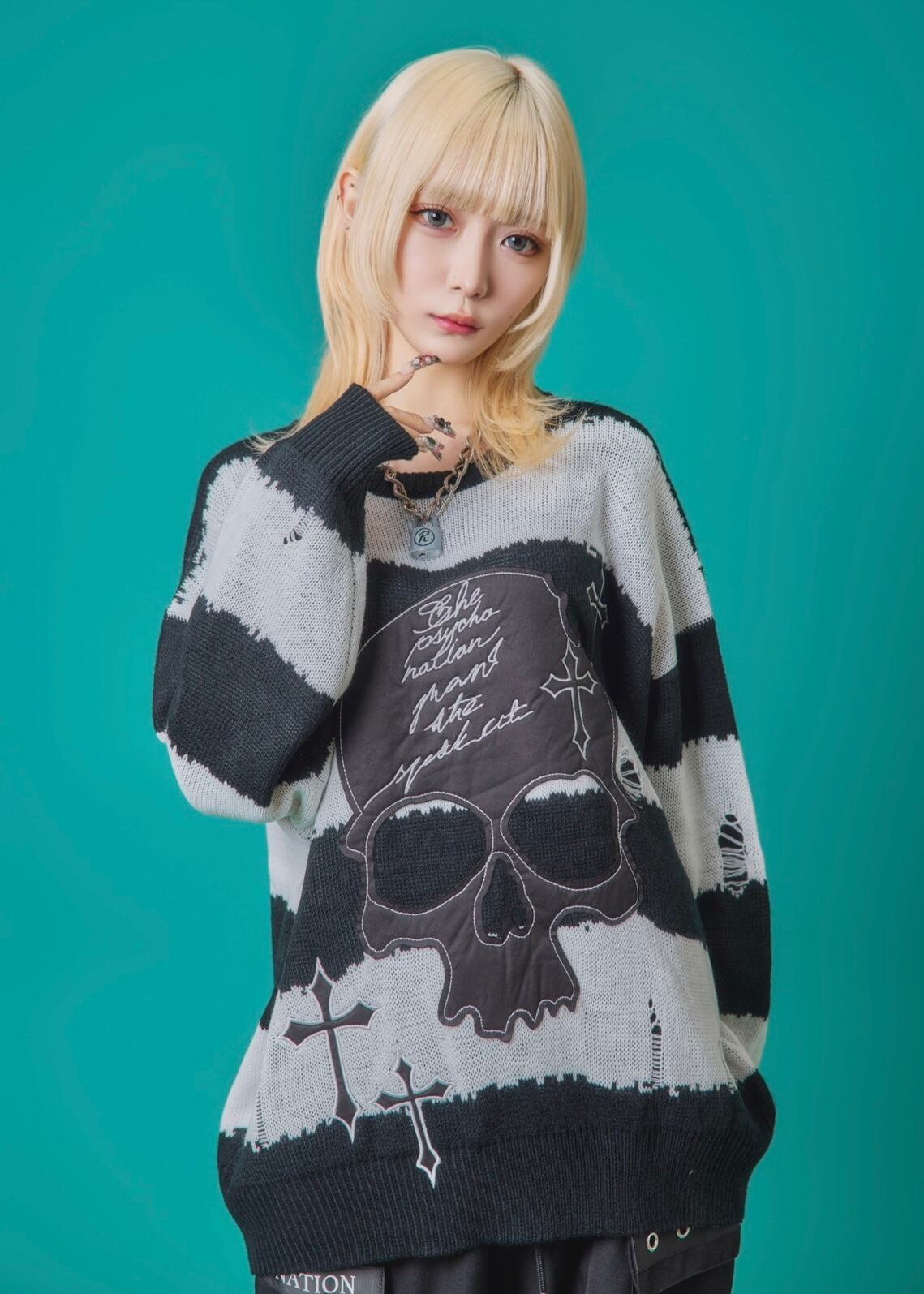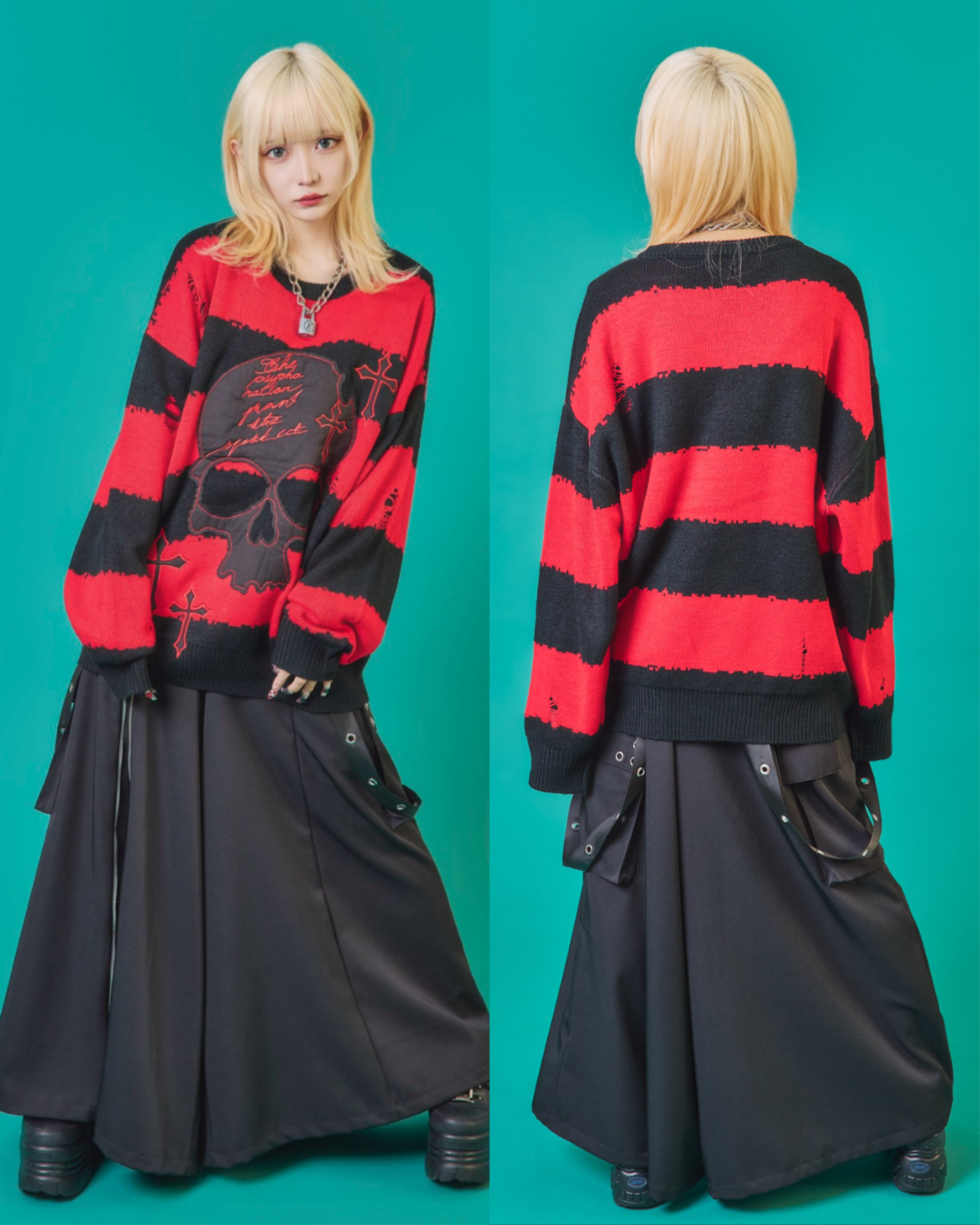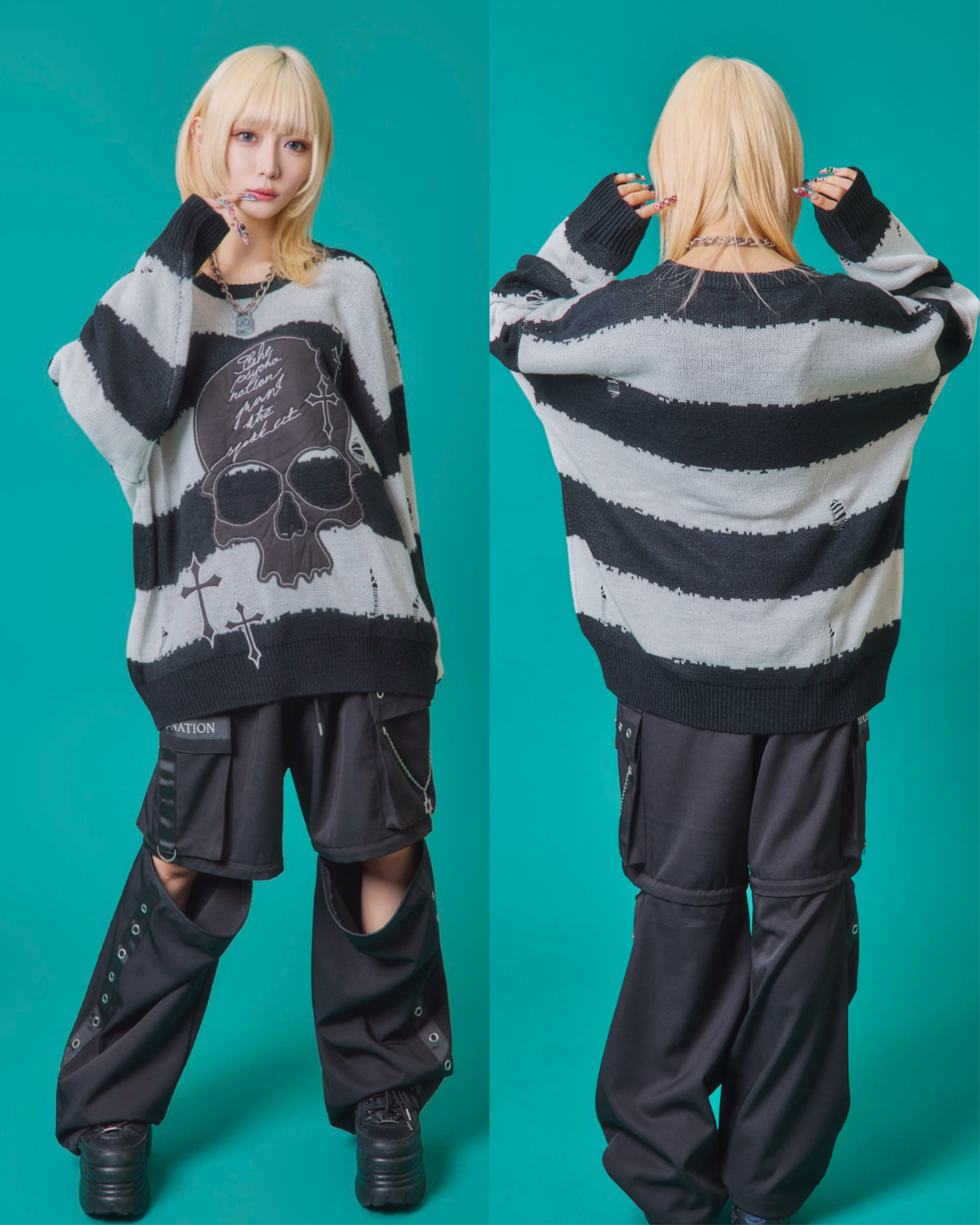 フロントに施されたスカル&クロスのパッチワークが印象的なニットトップス。ダメージ加工×ルーズシルエットで、抜け感のあるグランジスタイルを演出。ボーダーがモードな存在感を放ち、1枚でコーディネートを仕上げる主役級アイテム。ラフに着こなしても映える、存在感抜群のデザインニットです。