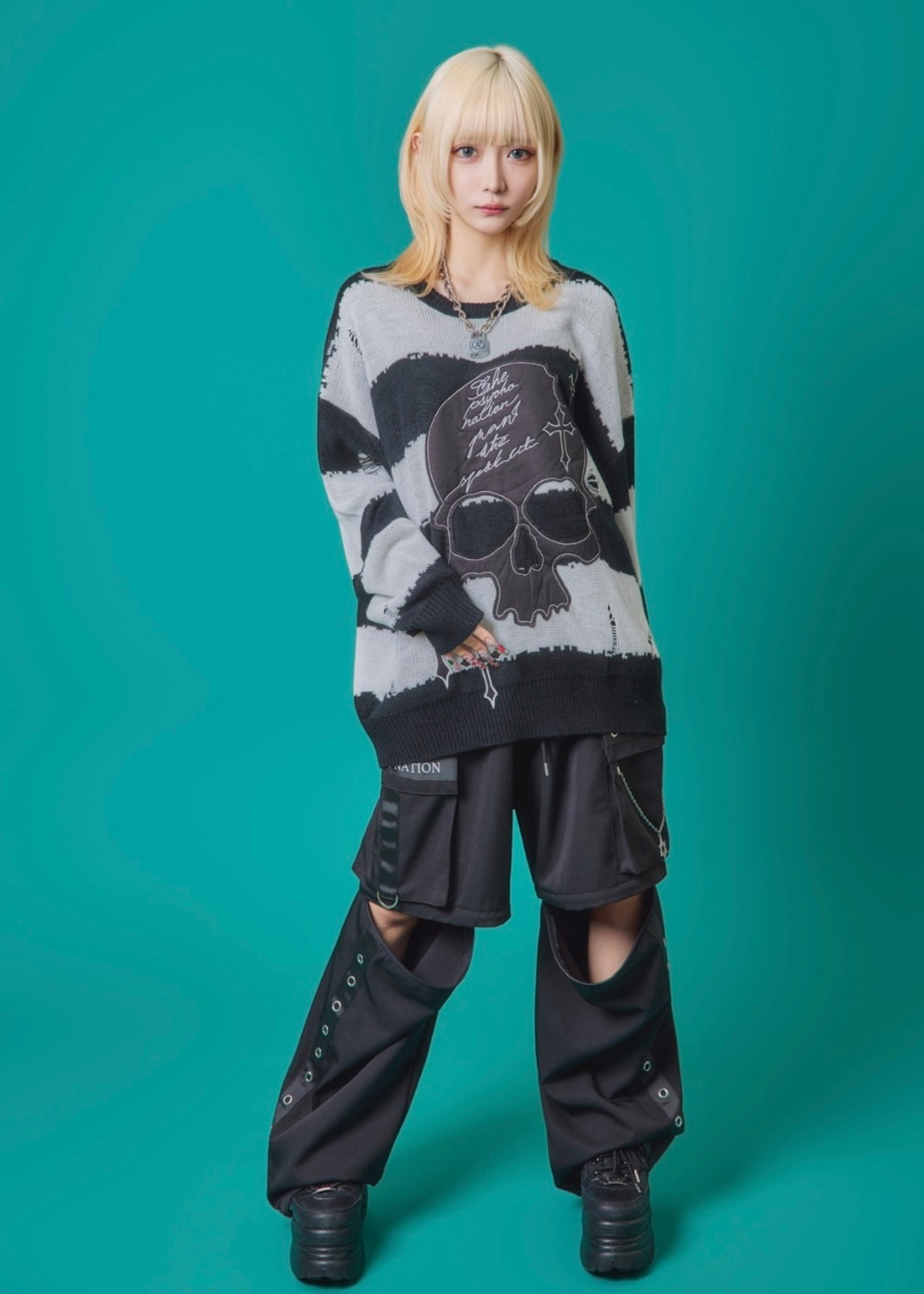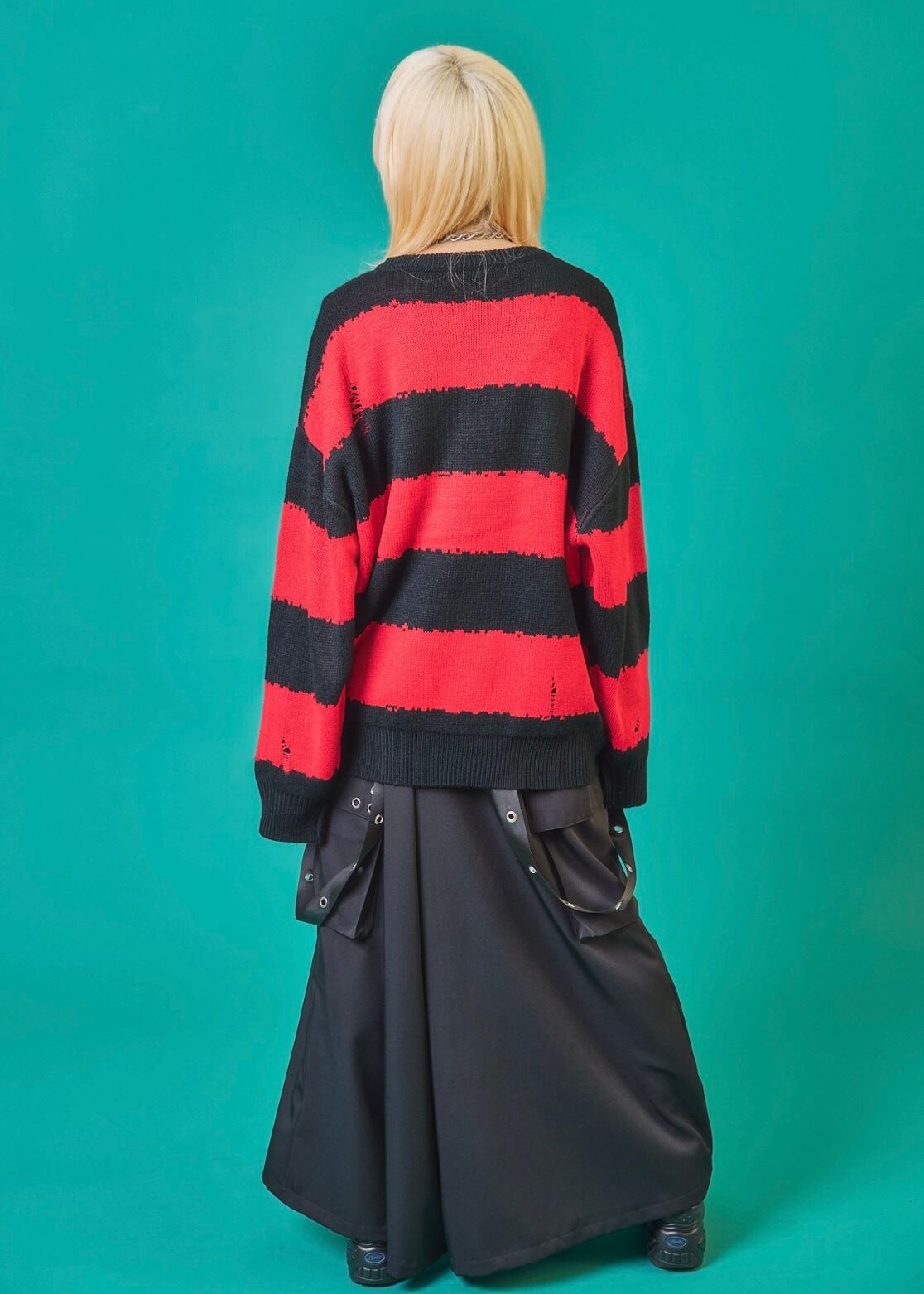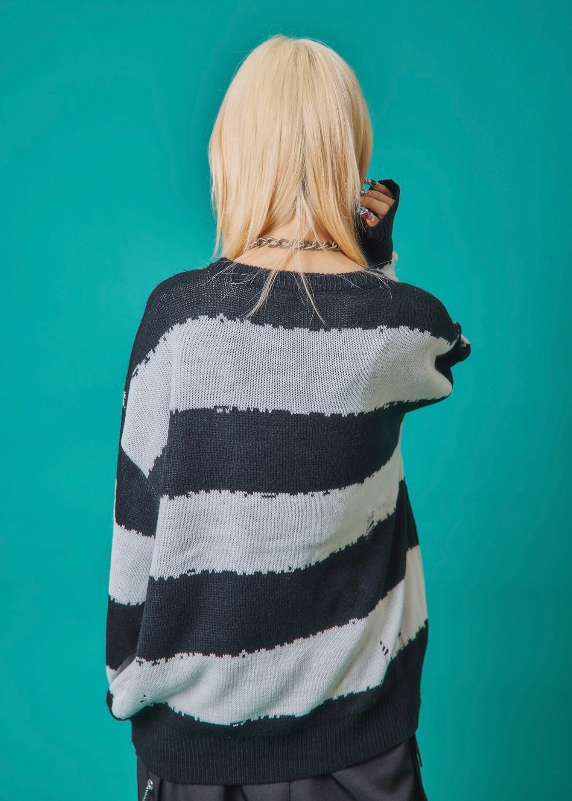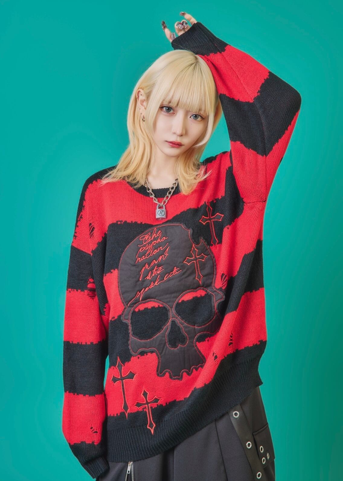 フロントに施されたスカル&クロスのパッチワークが印象的なニットトップス。ダメージ加工×ルーズシルエットで、抜け感のあるグランジスタイルを演出。ボーダーがモードな存在感を放ち、1枚でコーディネートを仕上げる主役級アイテム。ラフに着こなしても映える、存在感抜群のデザインニットです。
