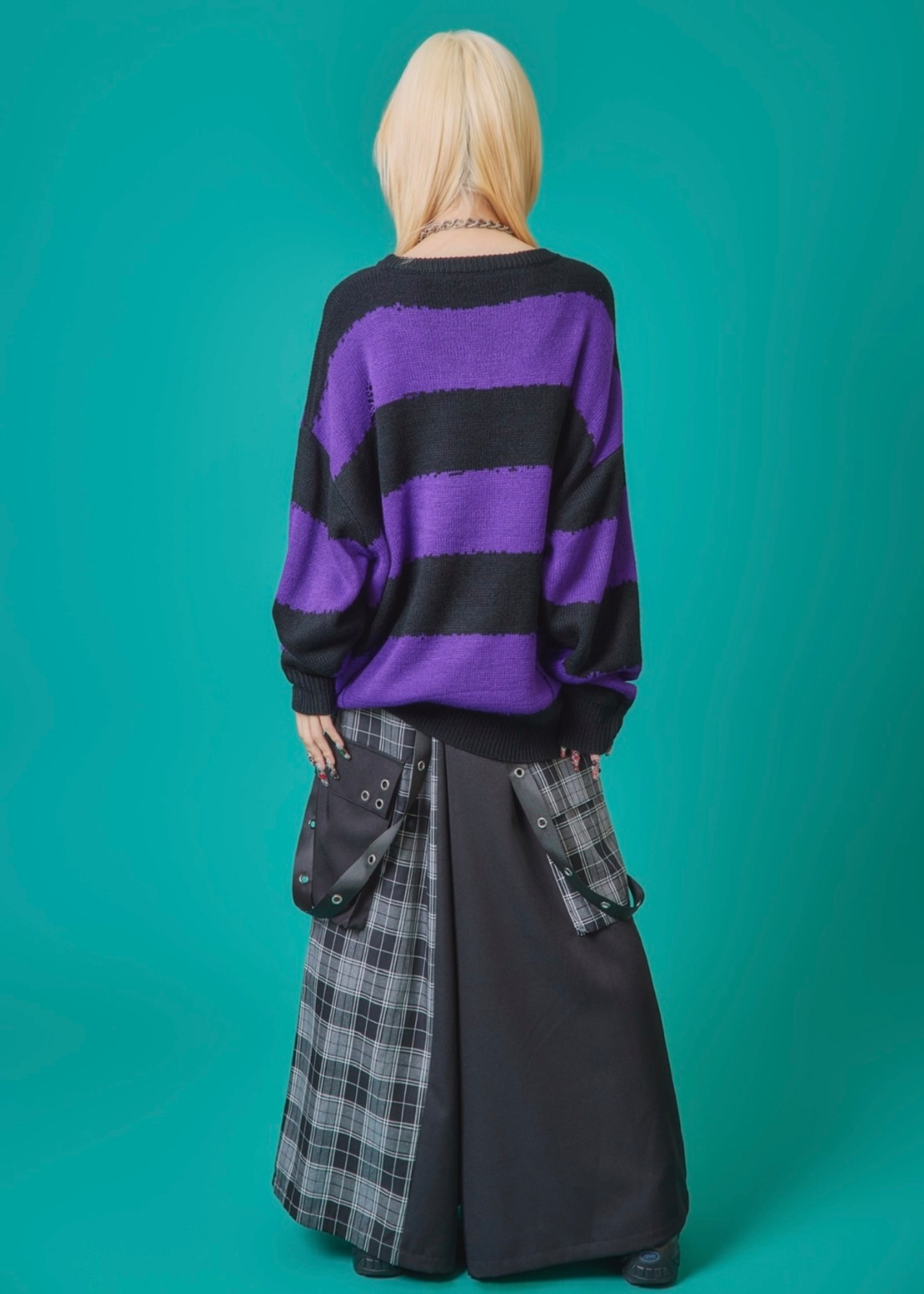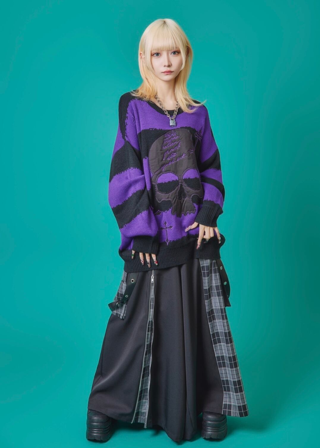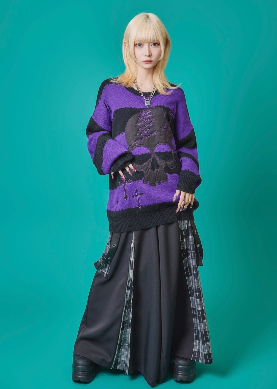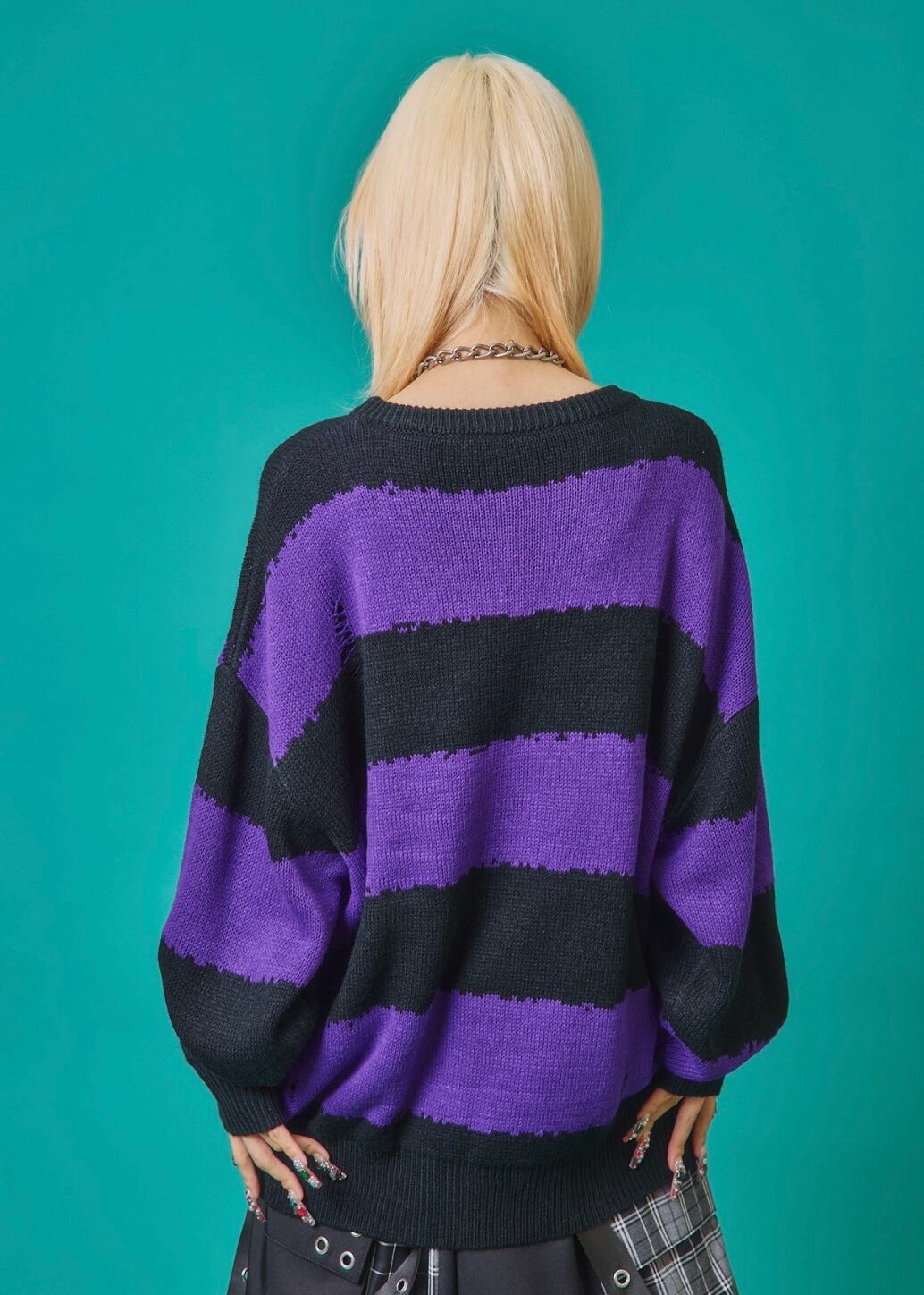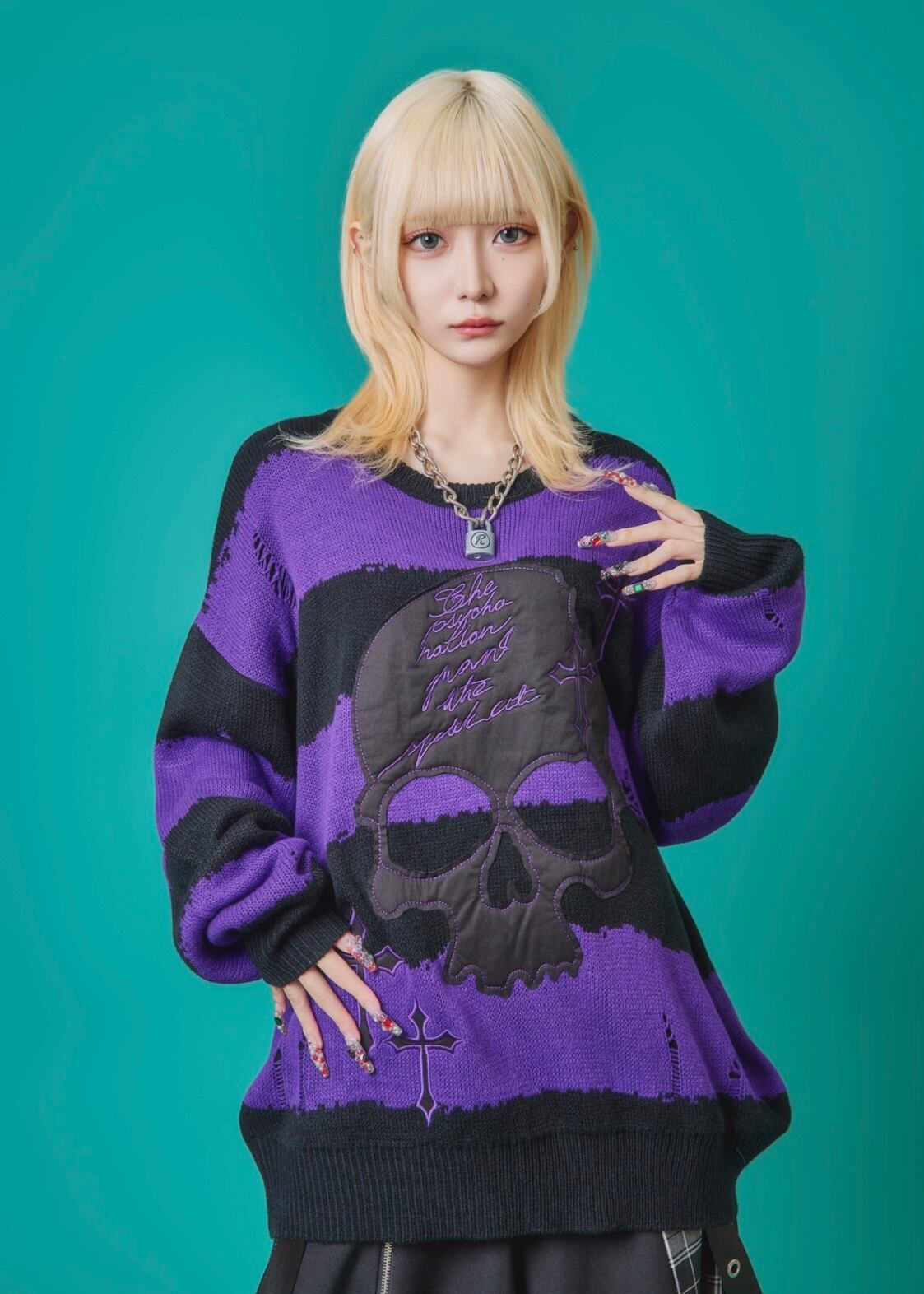フロントに施されたスカル&クロスのパッチワークが印象的なニットトップス。ダメージ加工×ルーズシルエットで、抜け感のあるグランジスタイルを演出。ボーダーがモードな存在感を放ち、1枚でコーディネートを仕上げる主役級アイテム。ラフに着こなしても映える、存在感抜群のデザインニットです。