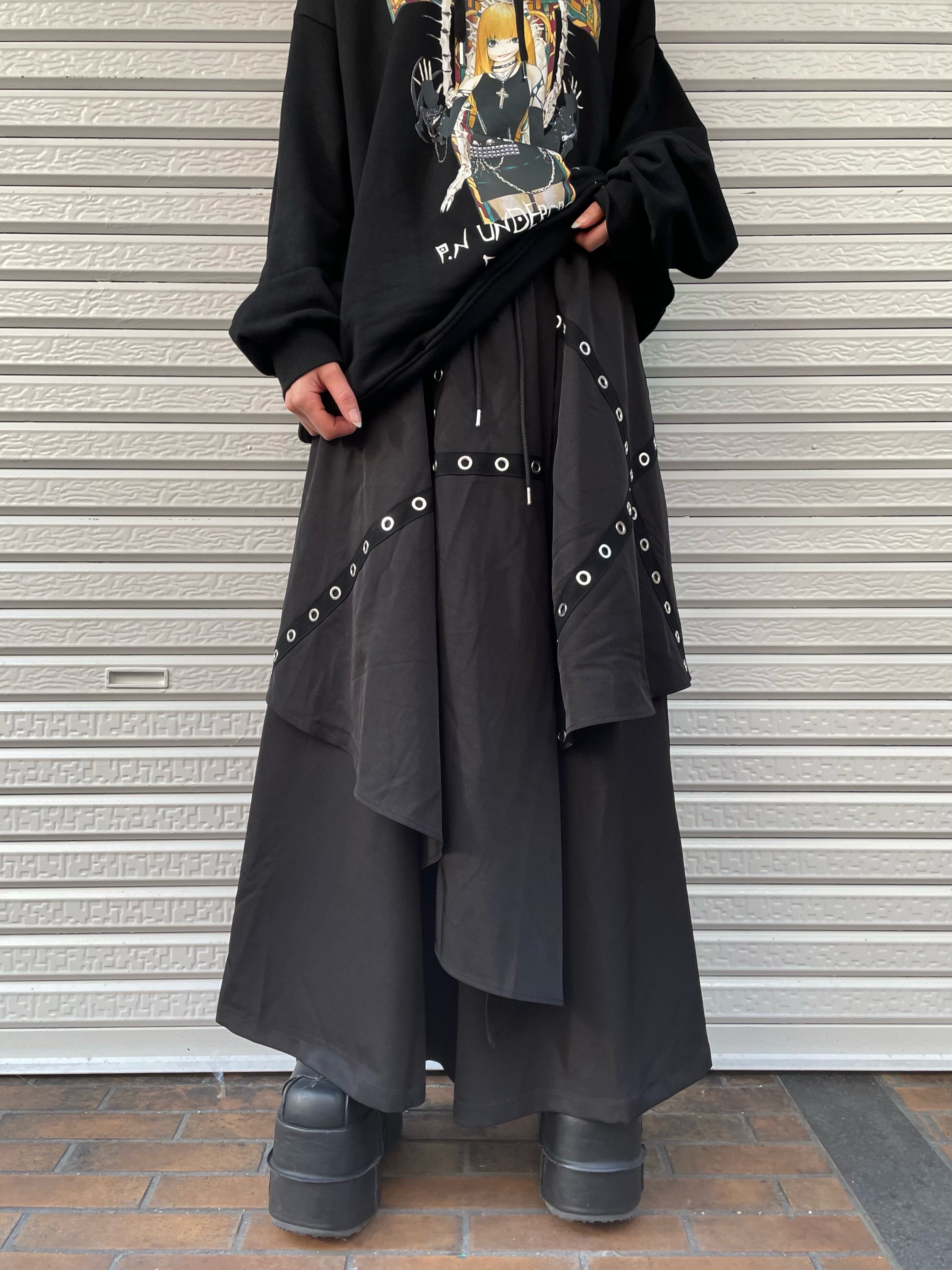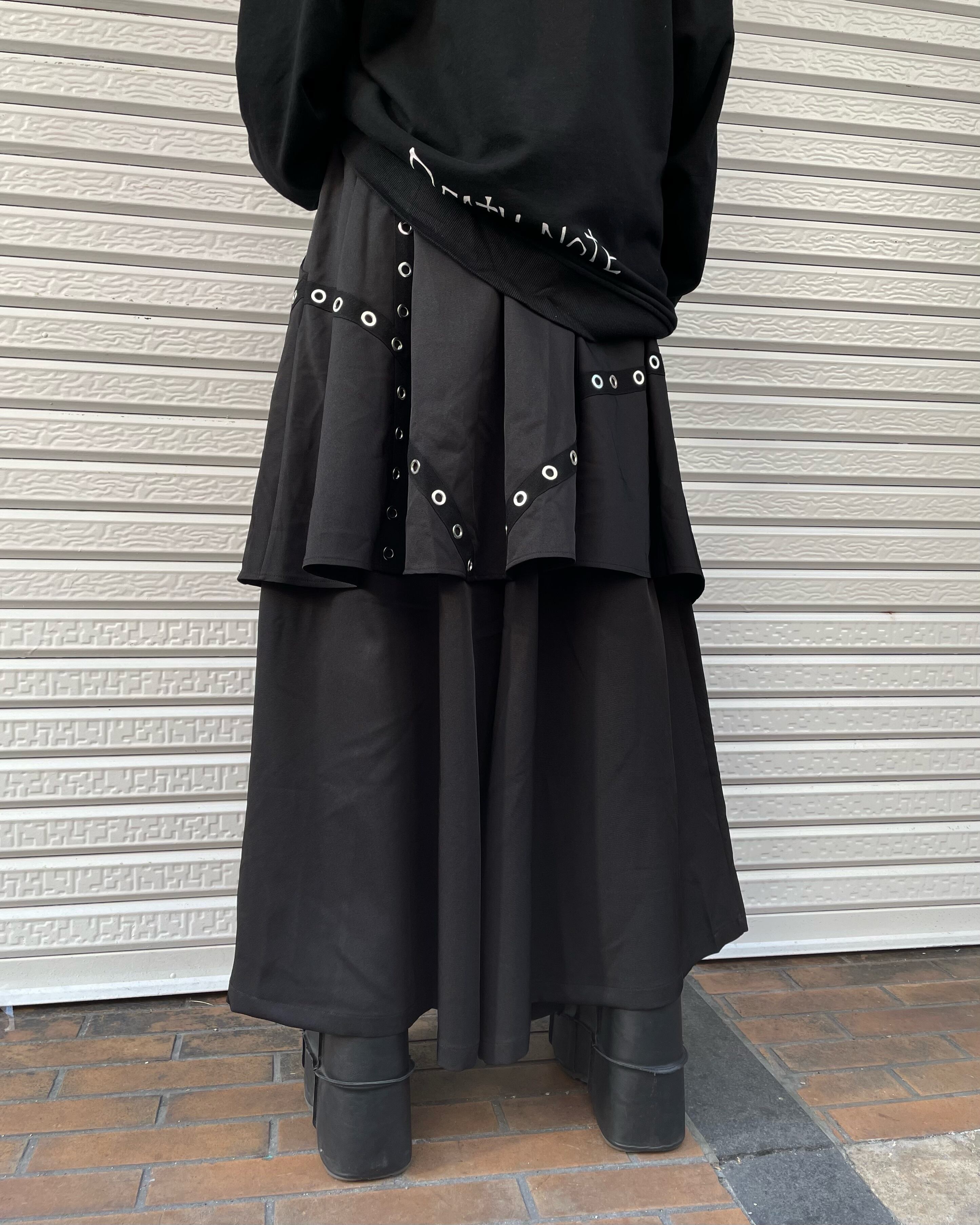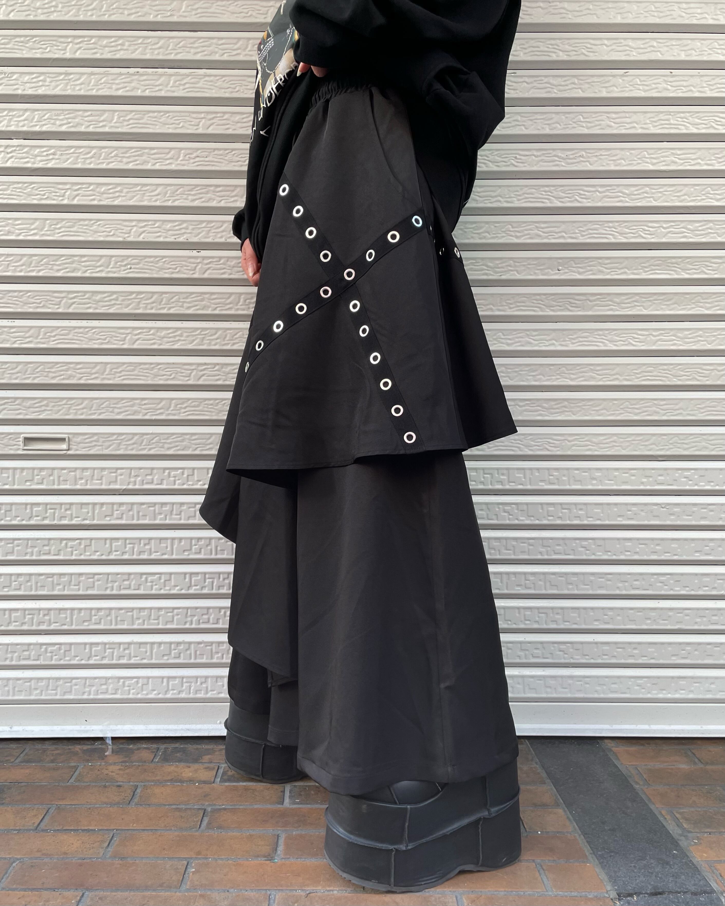 ワイドパンツをベースにスカートカバーしたスタイリングが、独特の個性を醸し出しています。個性的なデザインなのに、合わせやすく、ラクして酒落見せの実力派パンツ。