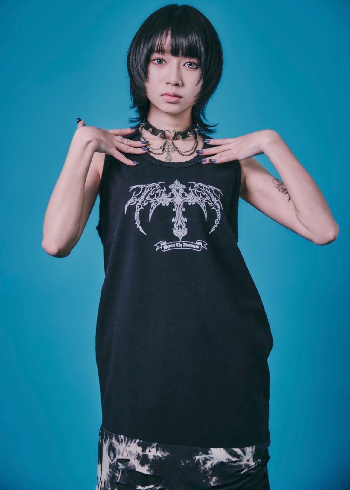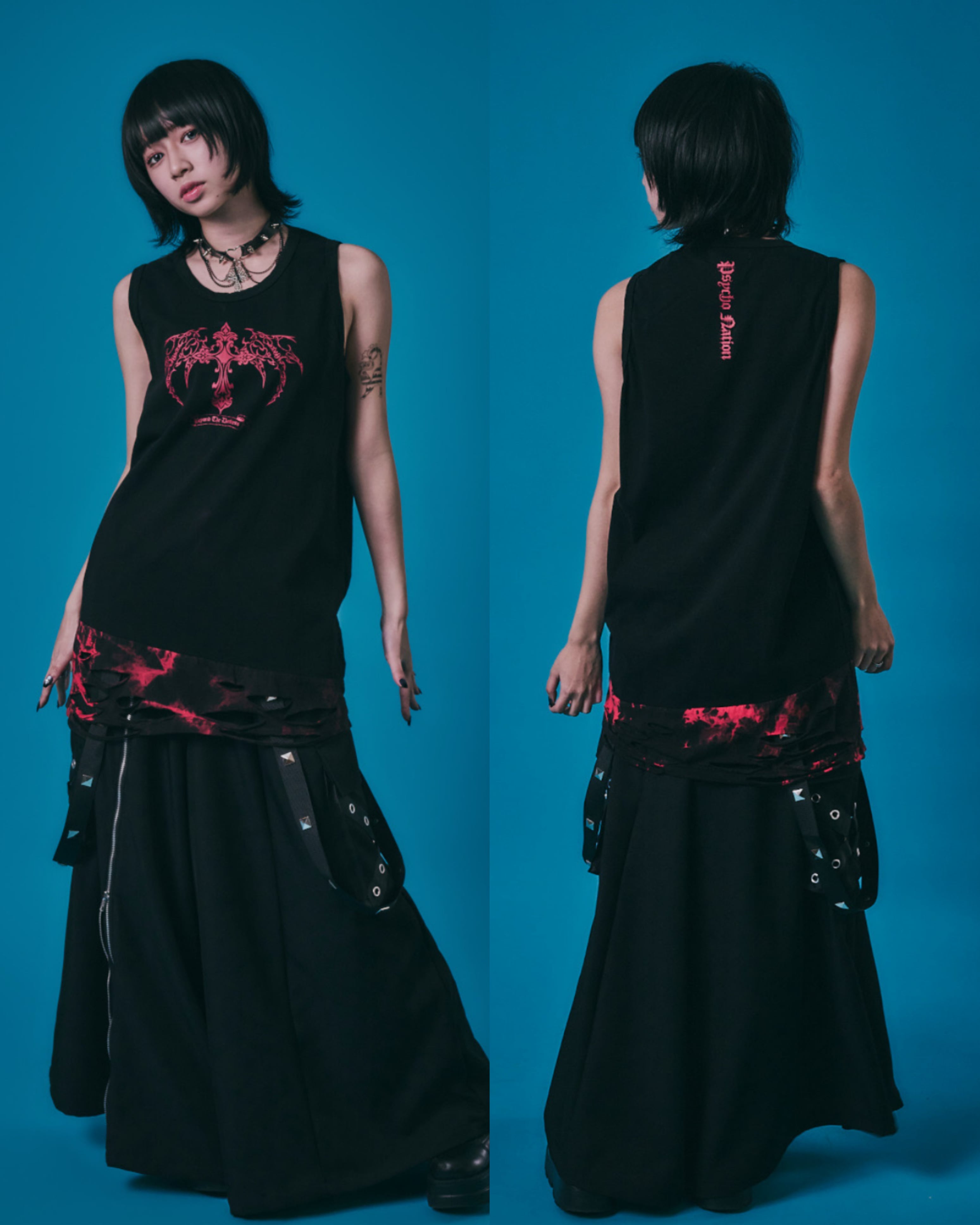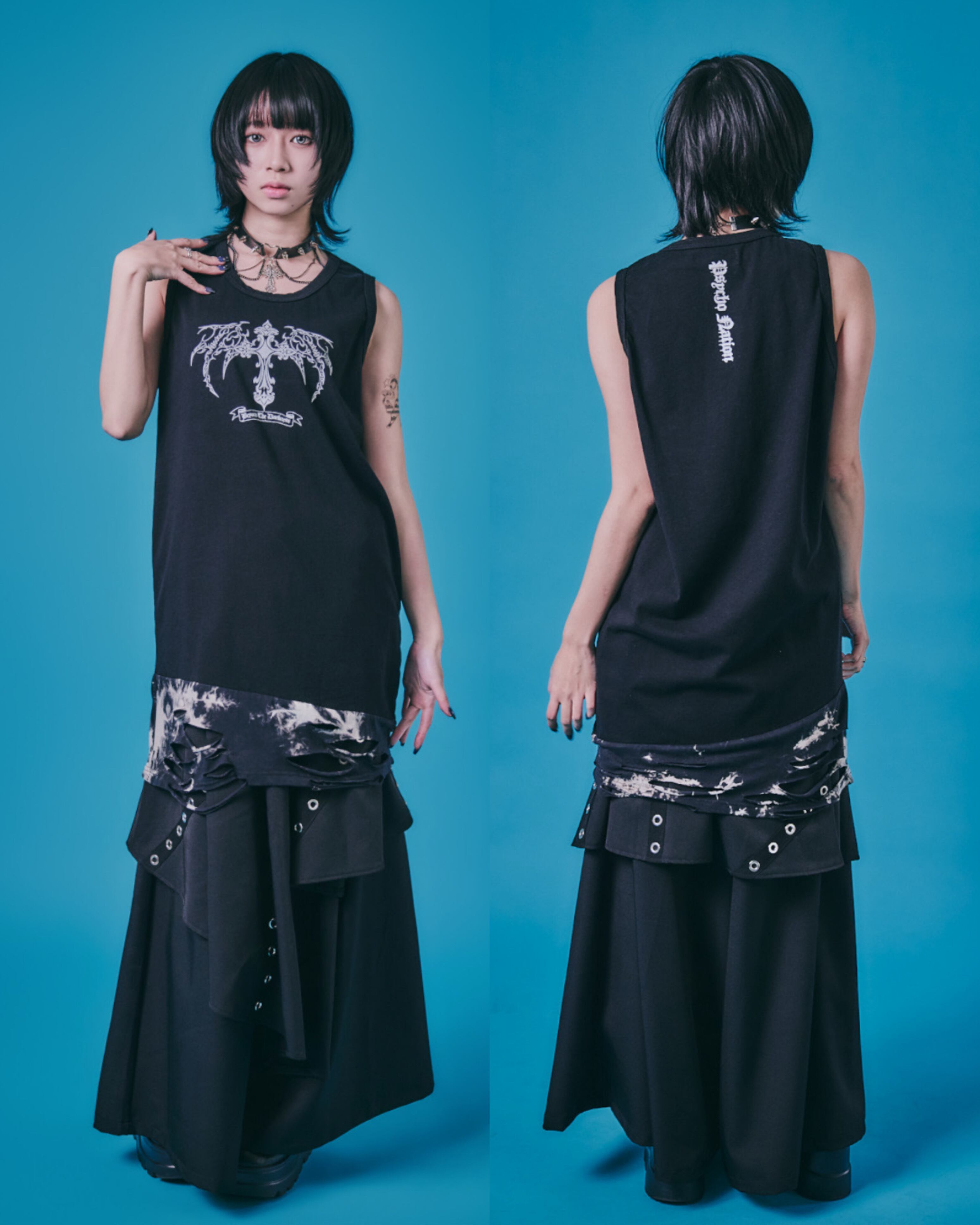 大胆なグラフィックとクラッシュ・デザインが目を引くロング・タンク・トップ。