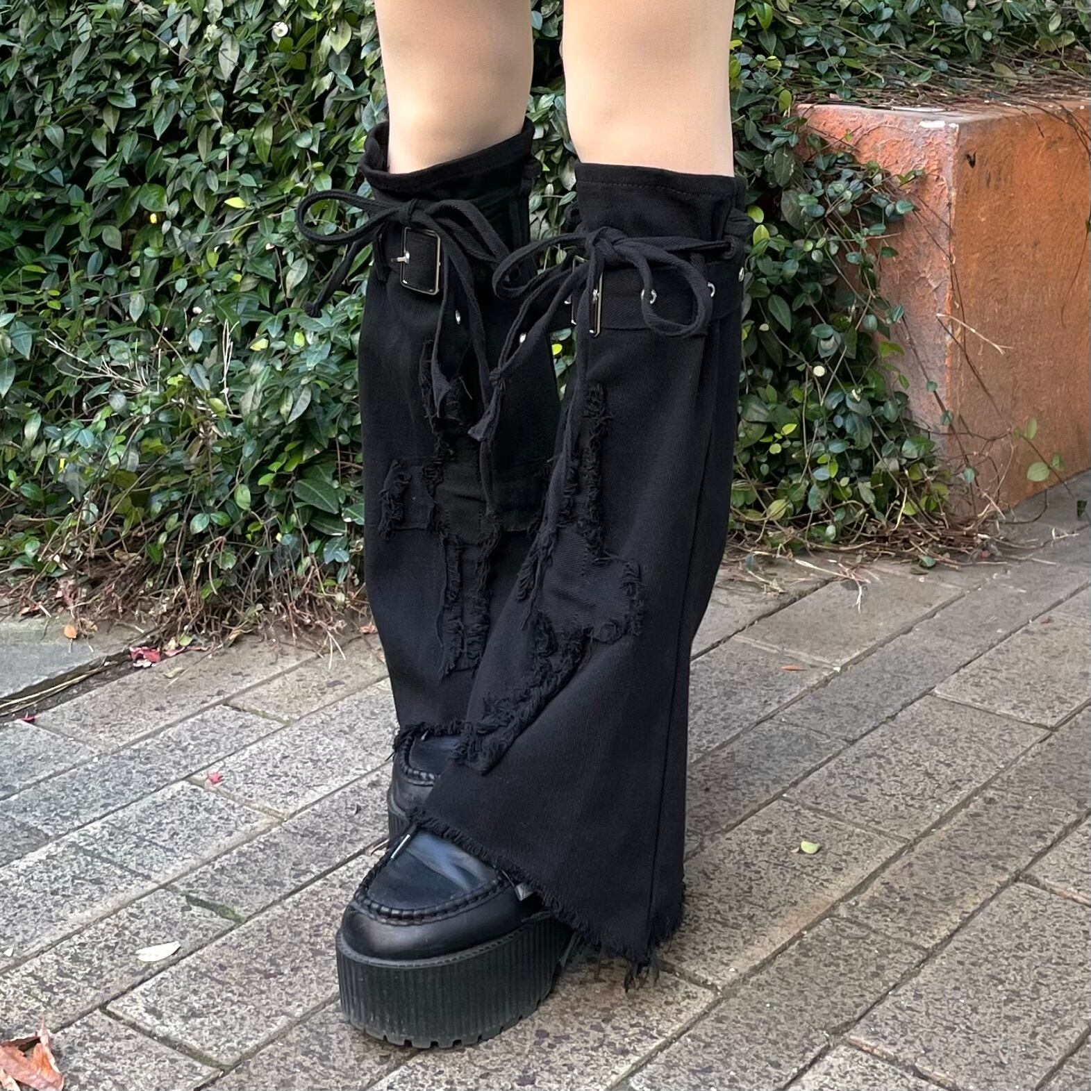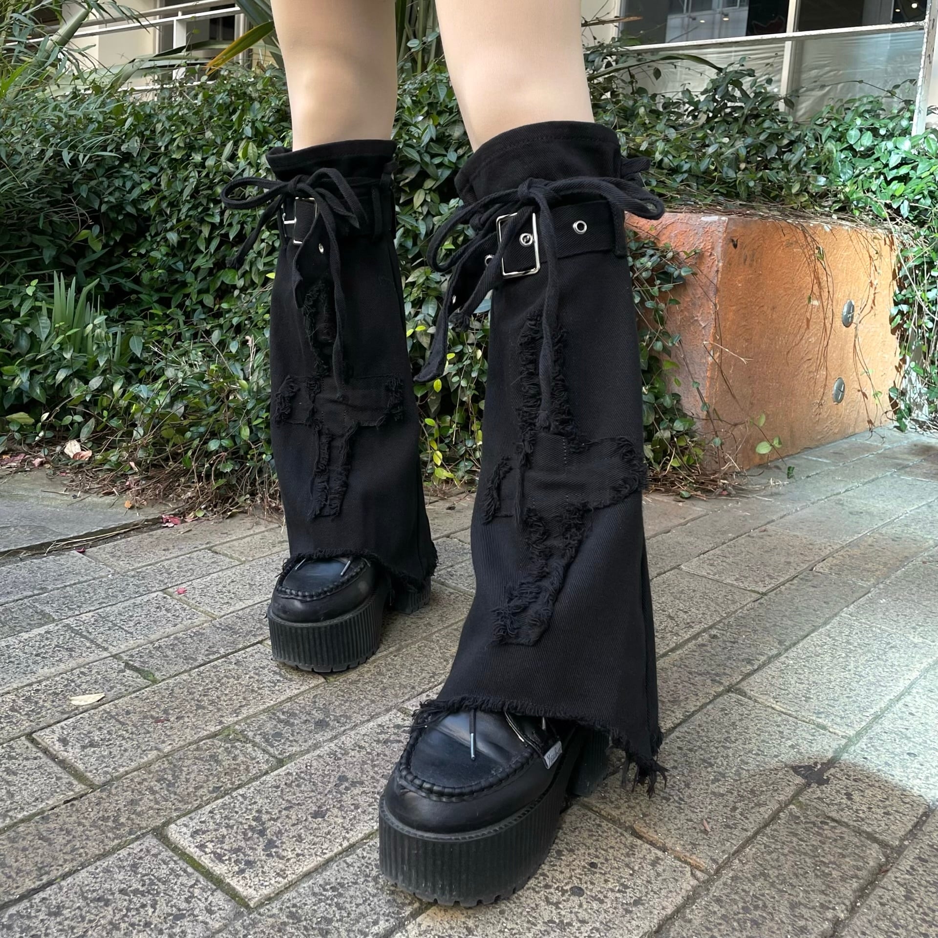 フロントのベルトや長い紐、クロスモチーフデザインのデニム生地レッグウォーマー!細部に施したダメージ加工がお洒落なデザイン!サブカルにもストリートにも幅広くお使い頂けるレッグウォーマー☆