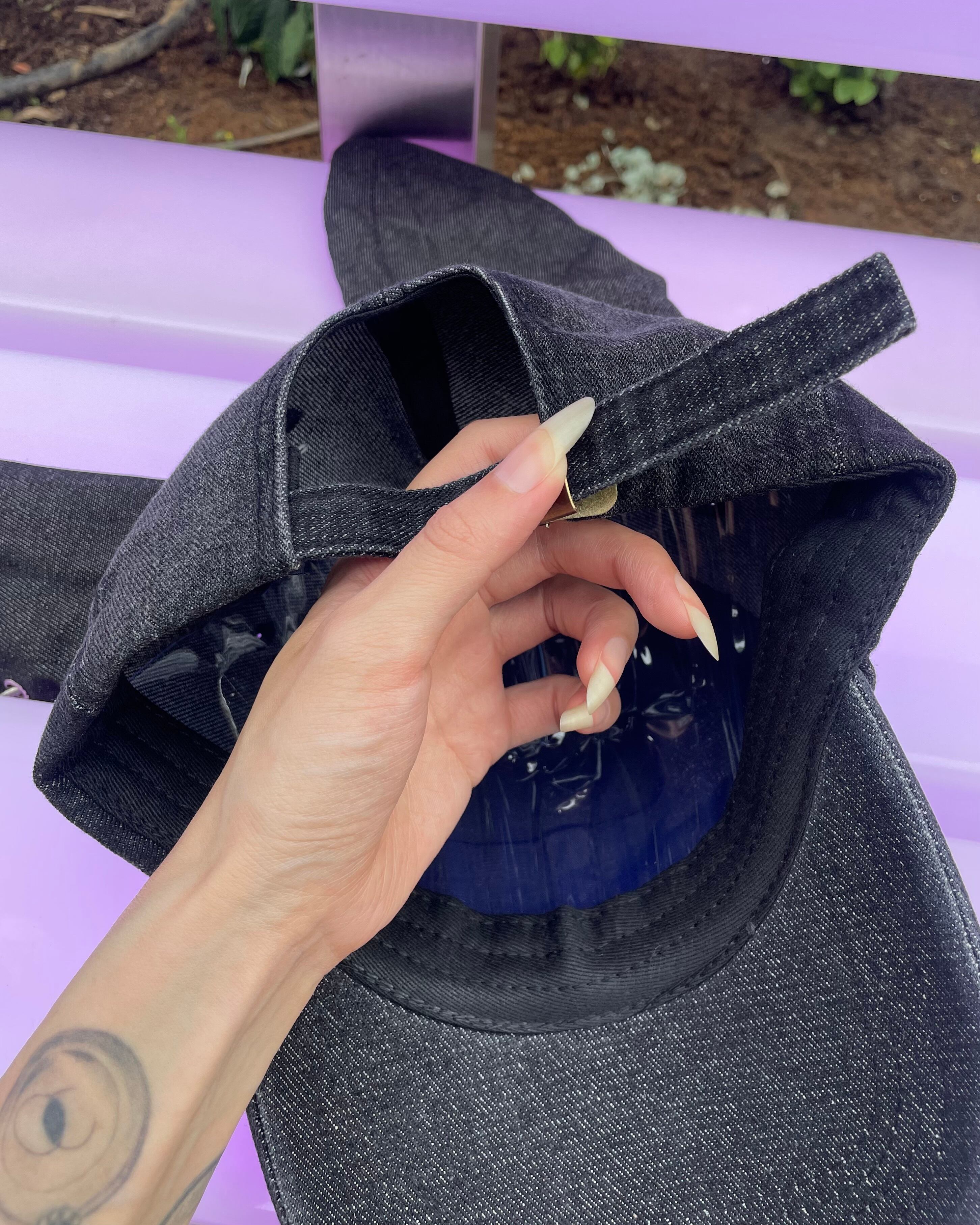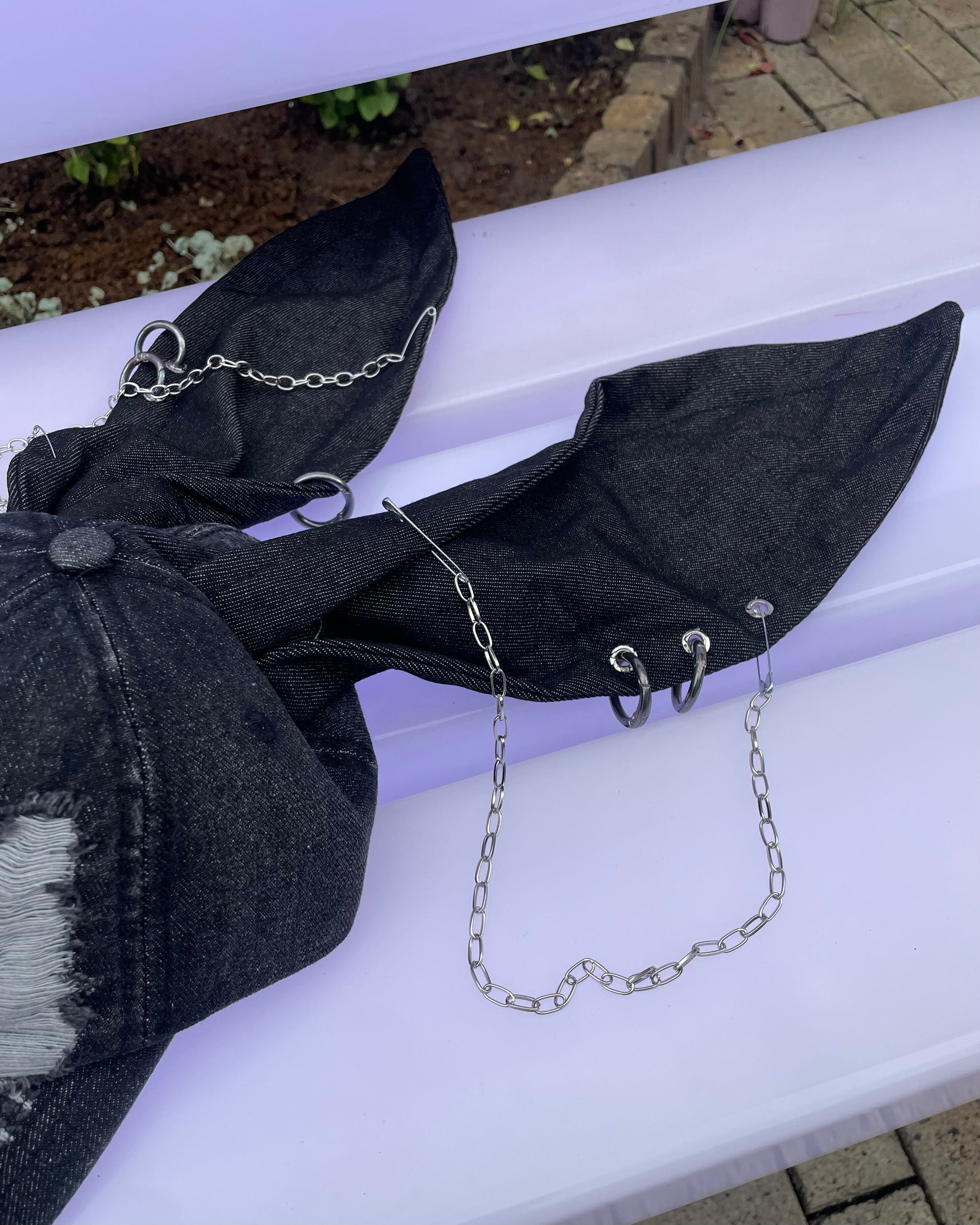 ダメージ加工を施した病み可愛い個性的なデニムキャップ!うさ耳にチェーンリングが付いたカッコ可愛いデザイン☆ストリート、y2k、サブカルにもお使い頂けるアイテム!