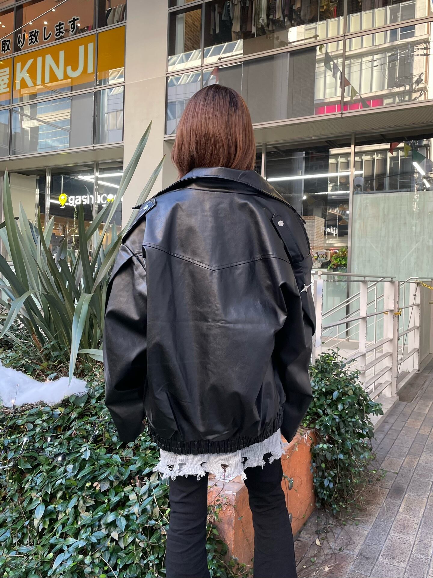 袖ZIP、フロントベルトデザインのフェイクレザーライダースジャケット☆流行りのオバーサイズで男女兼用でゆったり着用頂けます!スタッズ&袖ZIP付き!punkにサブカルに着こなしたい方におすすめ◎