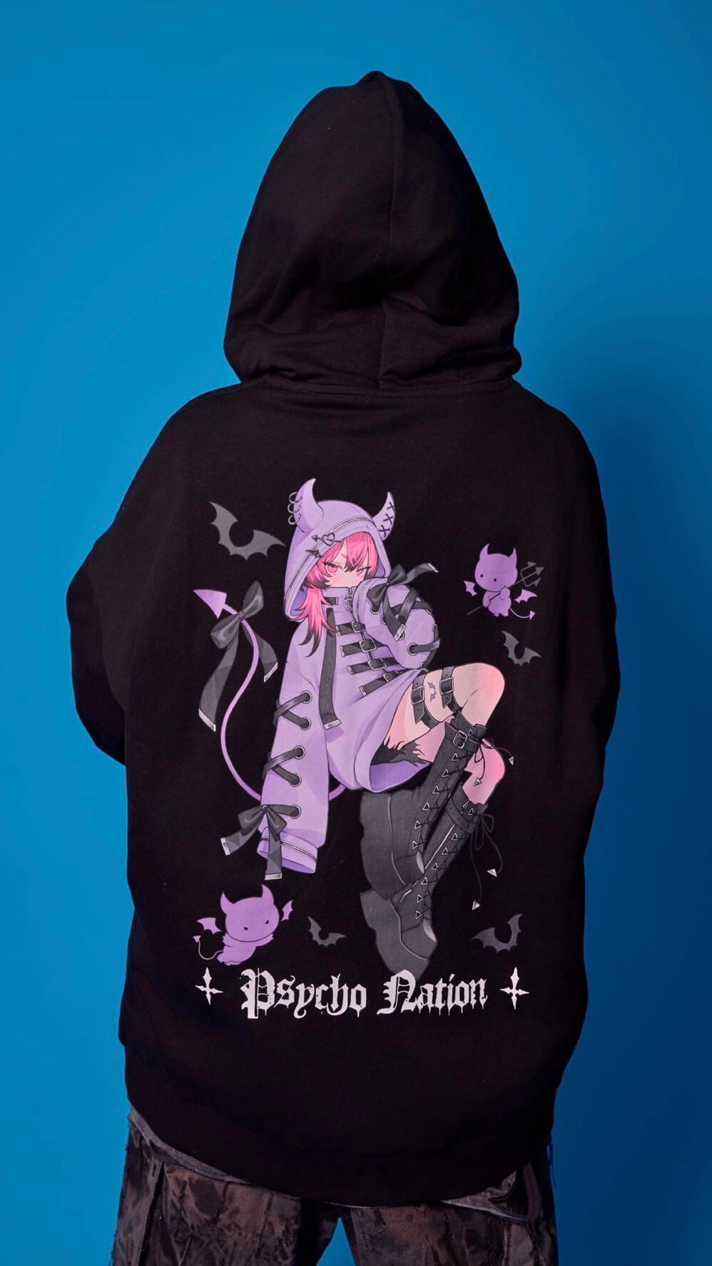バックには寝田ルネ書き下ろしのデビルモチーフのイラストとPSYCHO NATIONのロゴをデザインしたかっこかわいい、ホラーチックなデザイン。